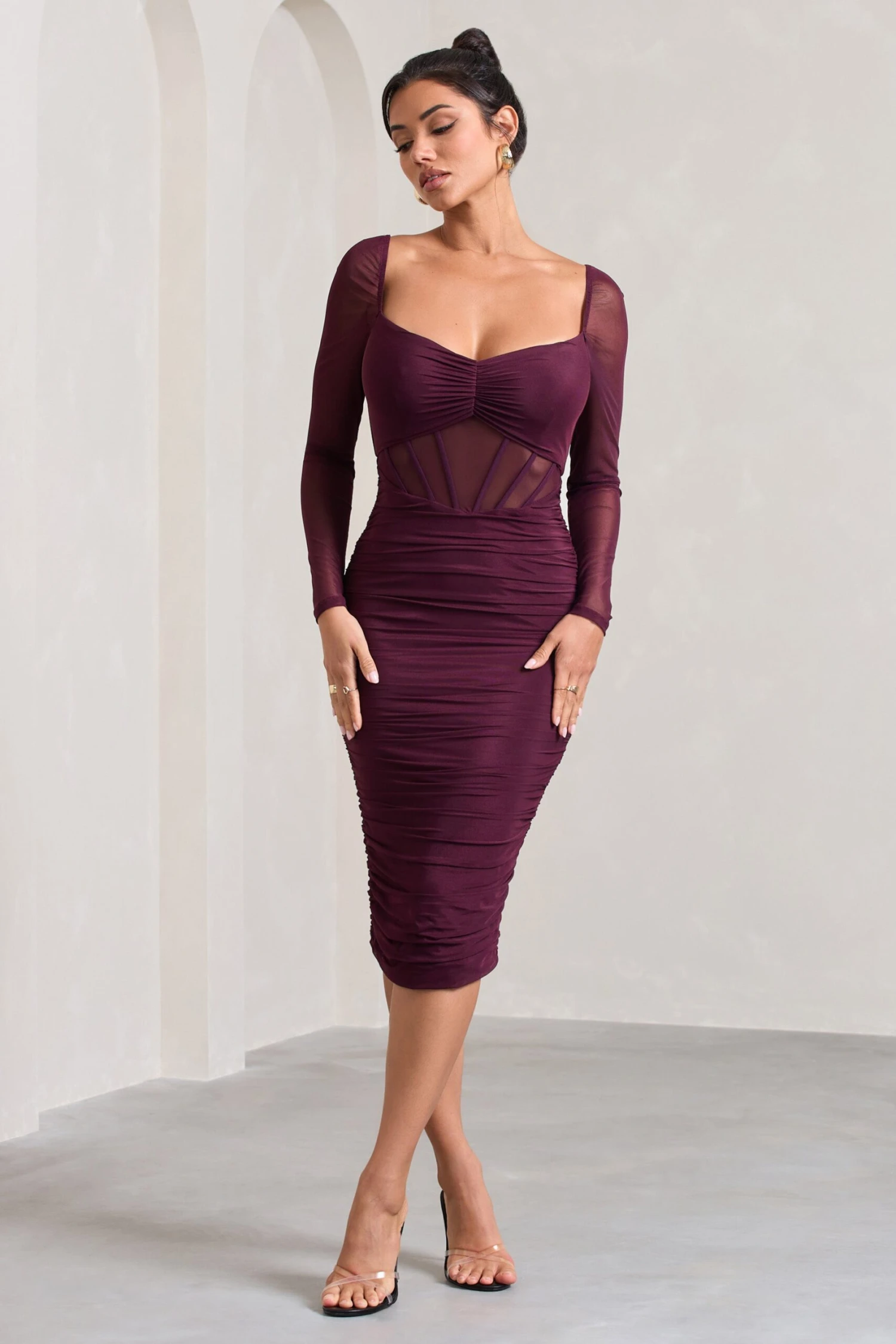 Abiba | Burgundy Ruched Mesh Corset Midi Dress With Long Sleeves