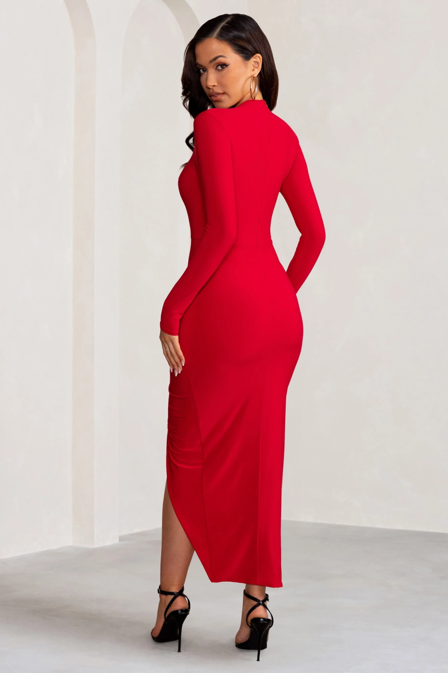 Alana | Red Long Sleeve High Neck Maxi Dress With Ruched Waist And Front Split