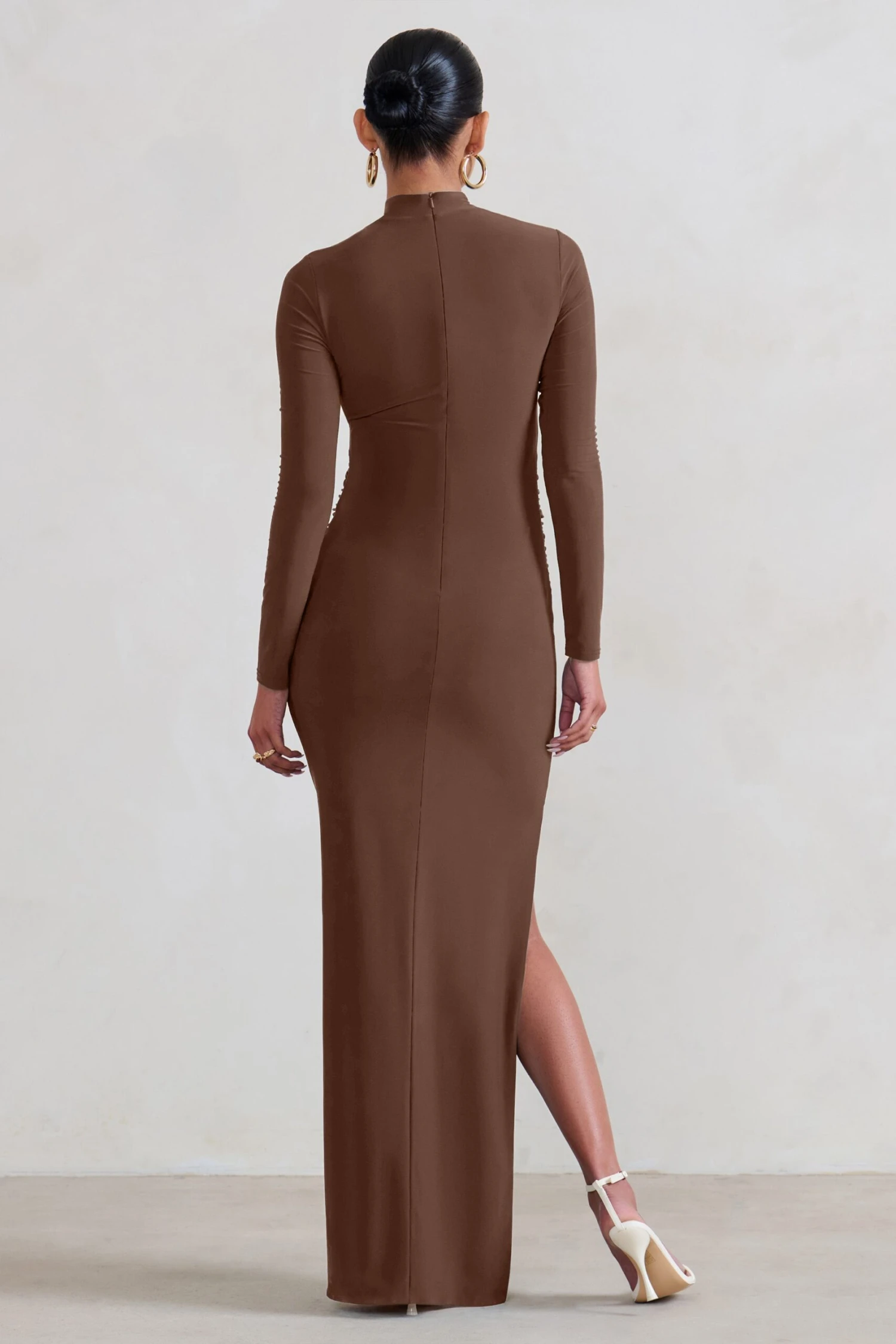 Sculpt your gorgeous growing silhouette in our latest maternity maxi dress, Alejandra. The perfect bodycon for that upcoming baby shower, this brown dress is designed in premium stretch jersey with long sleeves, a high neckline and a striking side split.