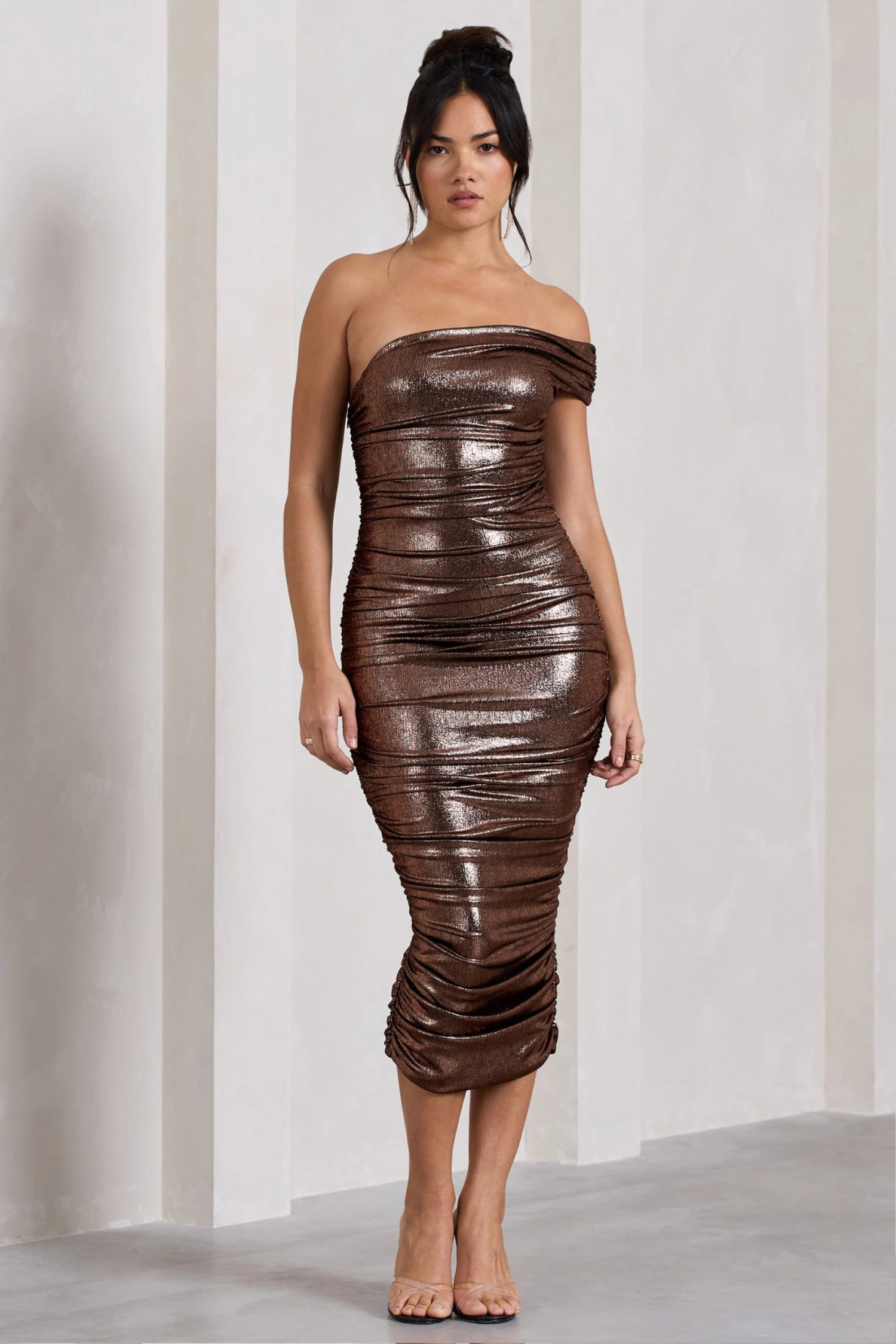 Designed in a glistening bronze metallic, Alma is a show-stopping piece guaranteed to leave a lasting impression. Wrapped in full body ruching, this figure-sculpting midi is highlighted by its bodycon silhouette, asymmetric neckline and striking split hemline. For an elegant wedding guest look, try pairing Alma with some sparkling statement earrings.Â