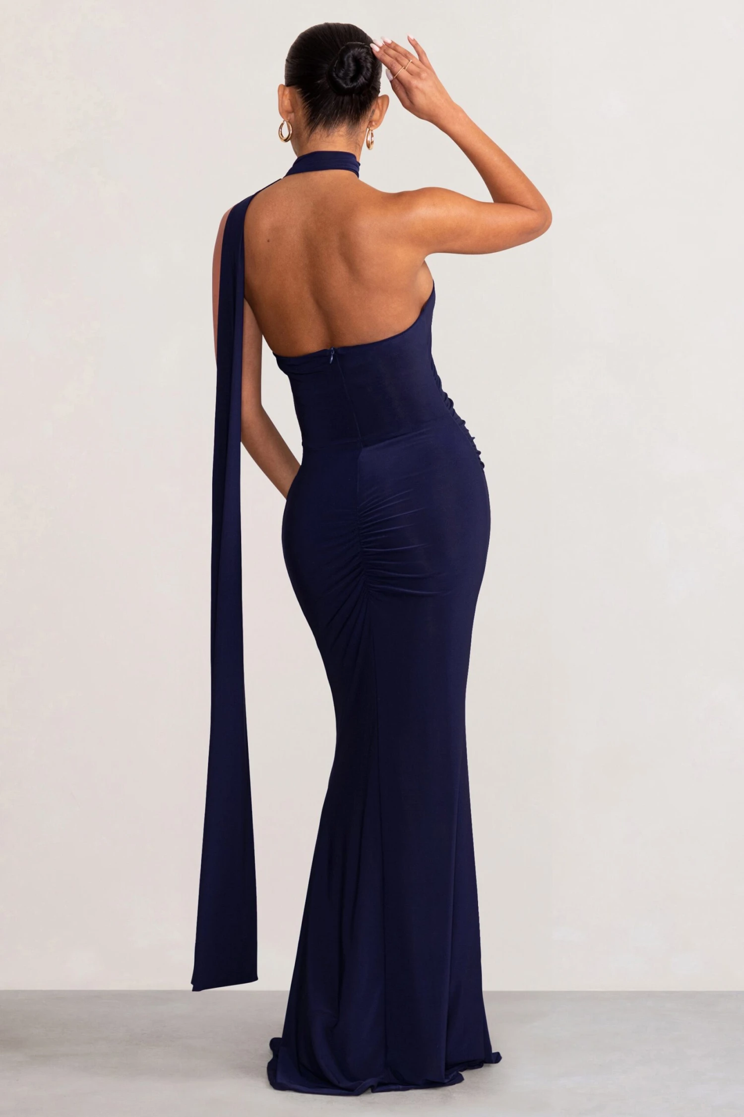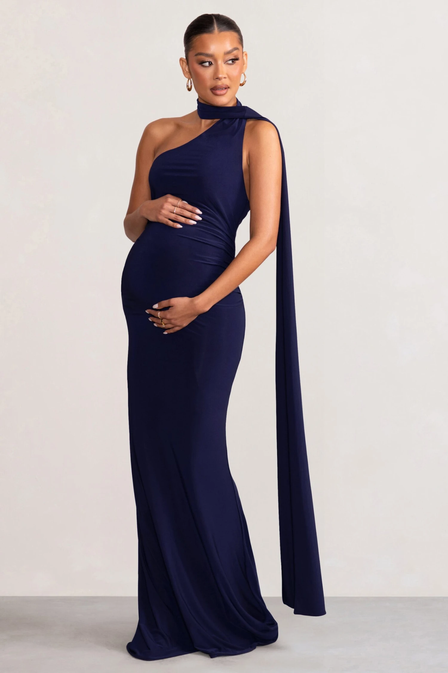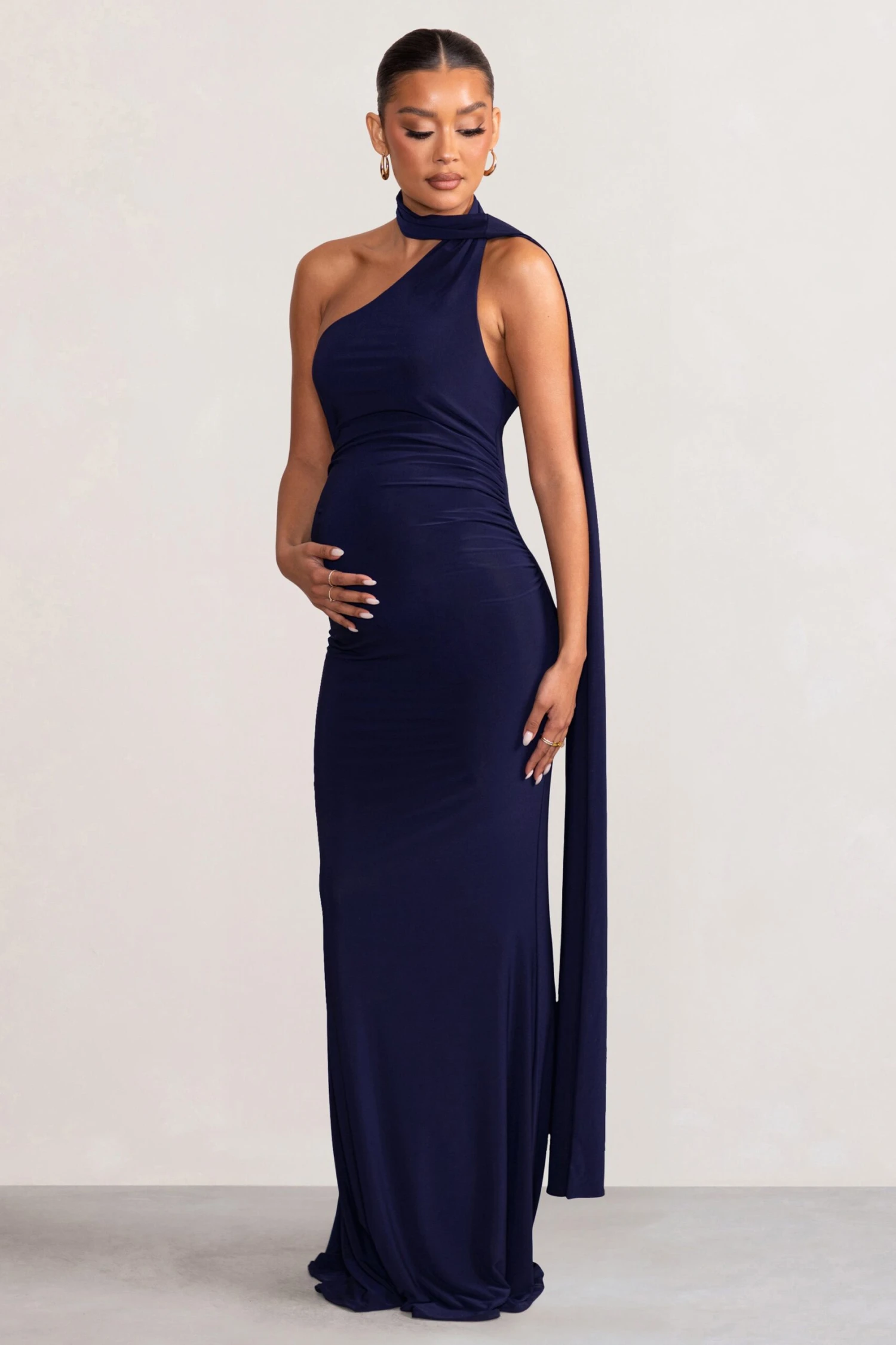 Celebrate your special arrival in something extra special this event season. Our Alula maxi dress is the statement dress of dreams with its navy hue and statement cape design. The cascading hemline will elongate your silhouette while the ruched detailing will sculpt and contour your bump. Designed for ultimate comfort in an ultra-stretch premium jersey and double lined for modesty, this dress is a must-have for your maternity wardrobe.