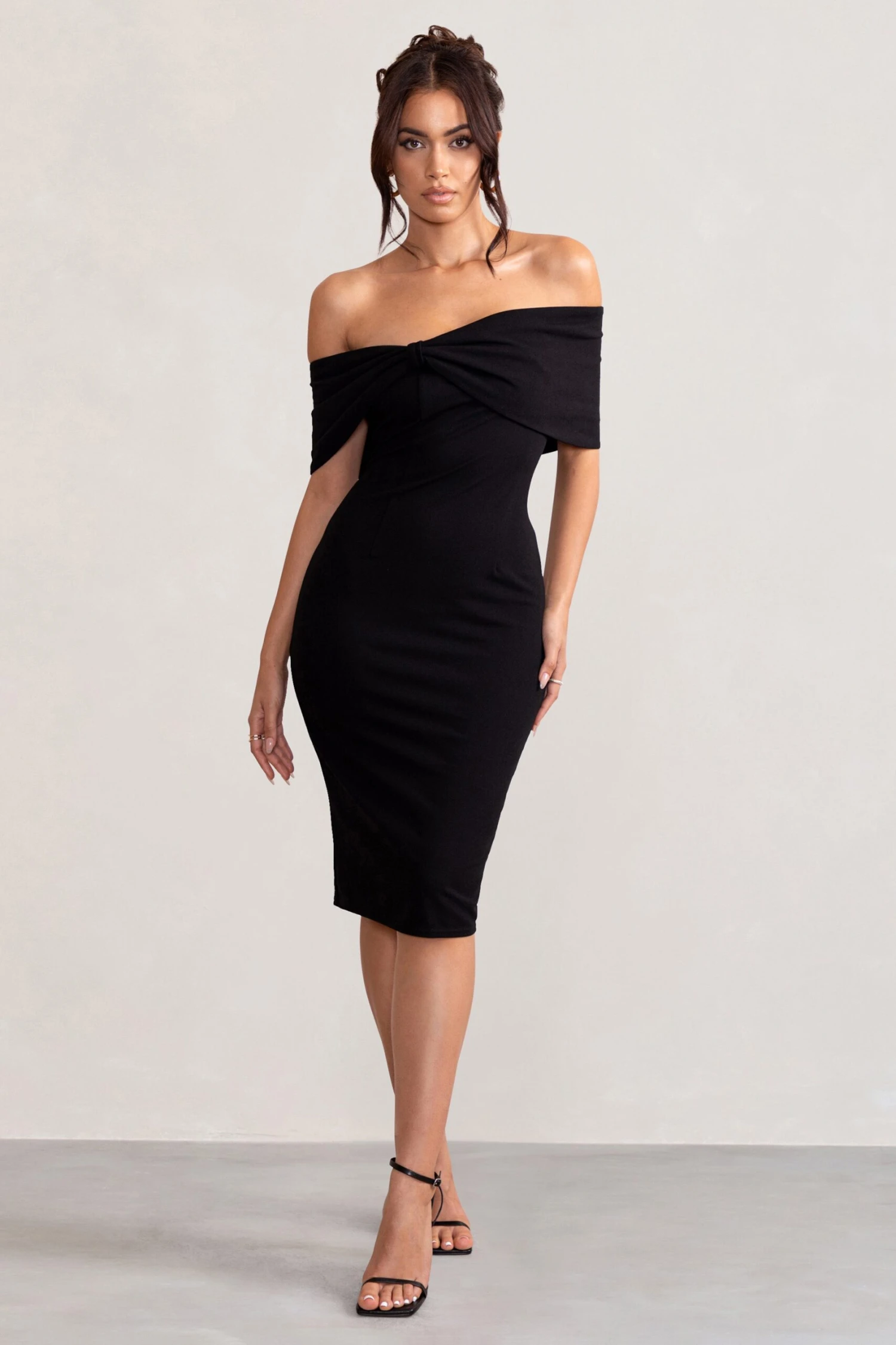 Meet Alyssa, our must-have midi dress made from a black scuba crepe that’s both supportive and sculpting. Sure to turn heads at any formal event from birthdays to baby showers, this black bodycon dress features a Bardot neckline wrapped by a large bow and a split fitted skirt.