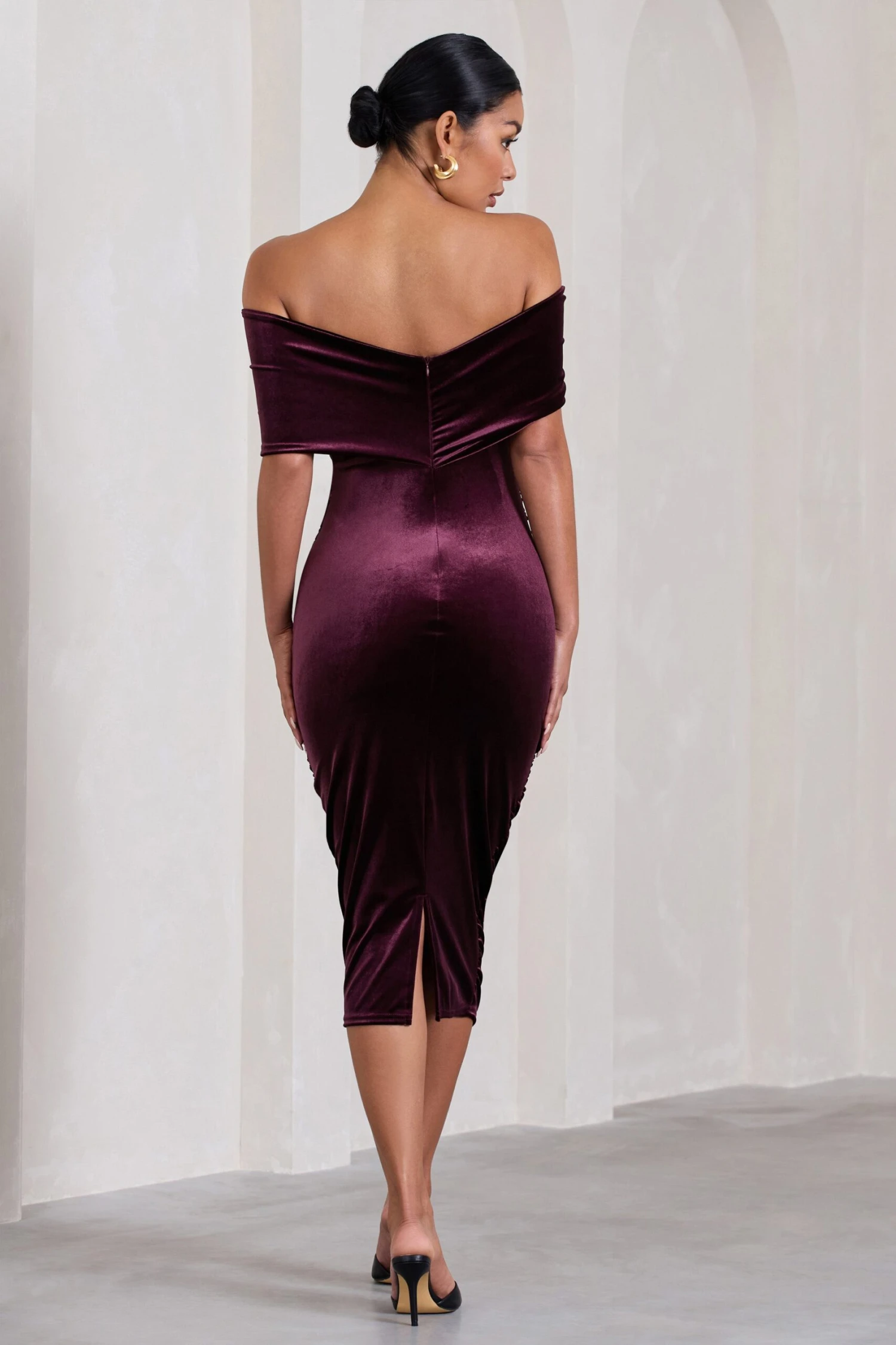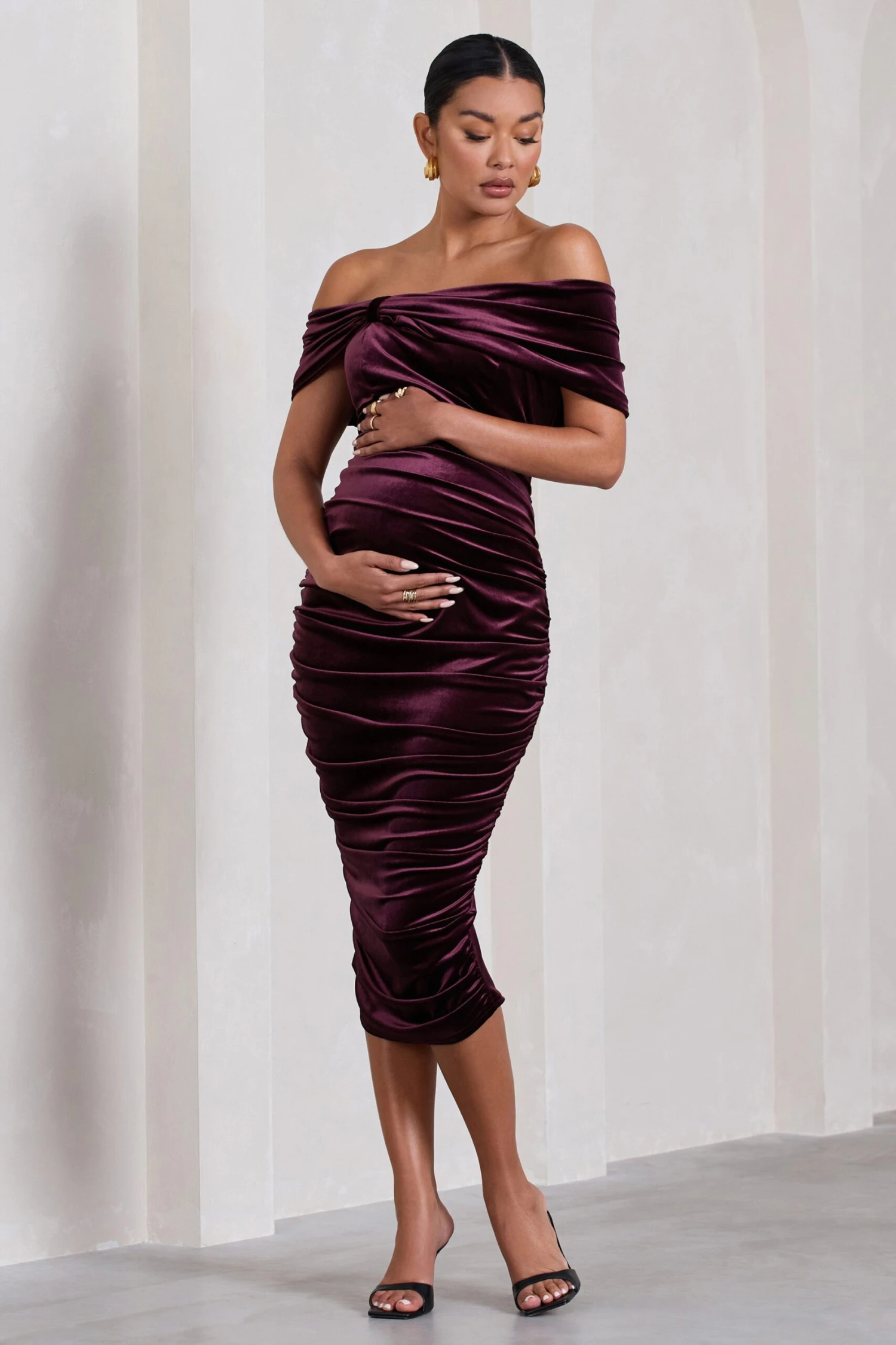 Meet Alyssa, our must-have midi dress made from a rich port velvet that’s both supportive and sculpting. Sure to turn heads at any formal event from birthdays to baby showers, this maternity dress features a bardot neckline wrapped by a large bow and a split fitted skirt.