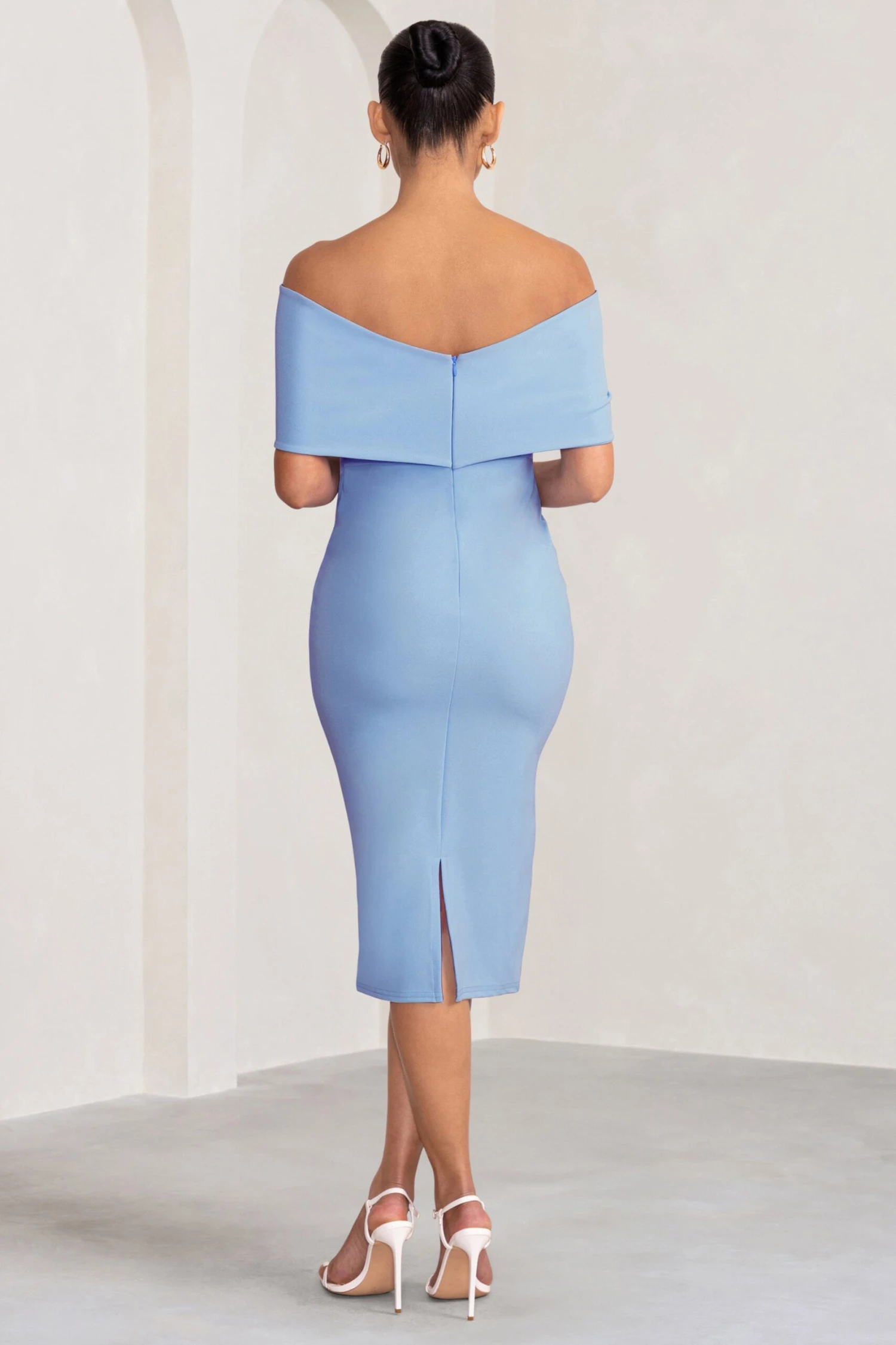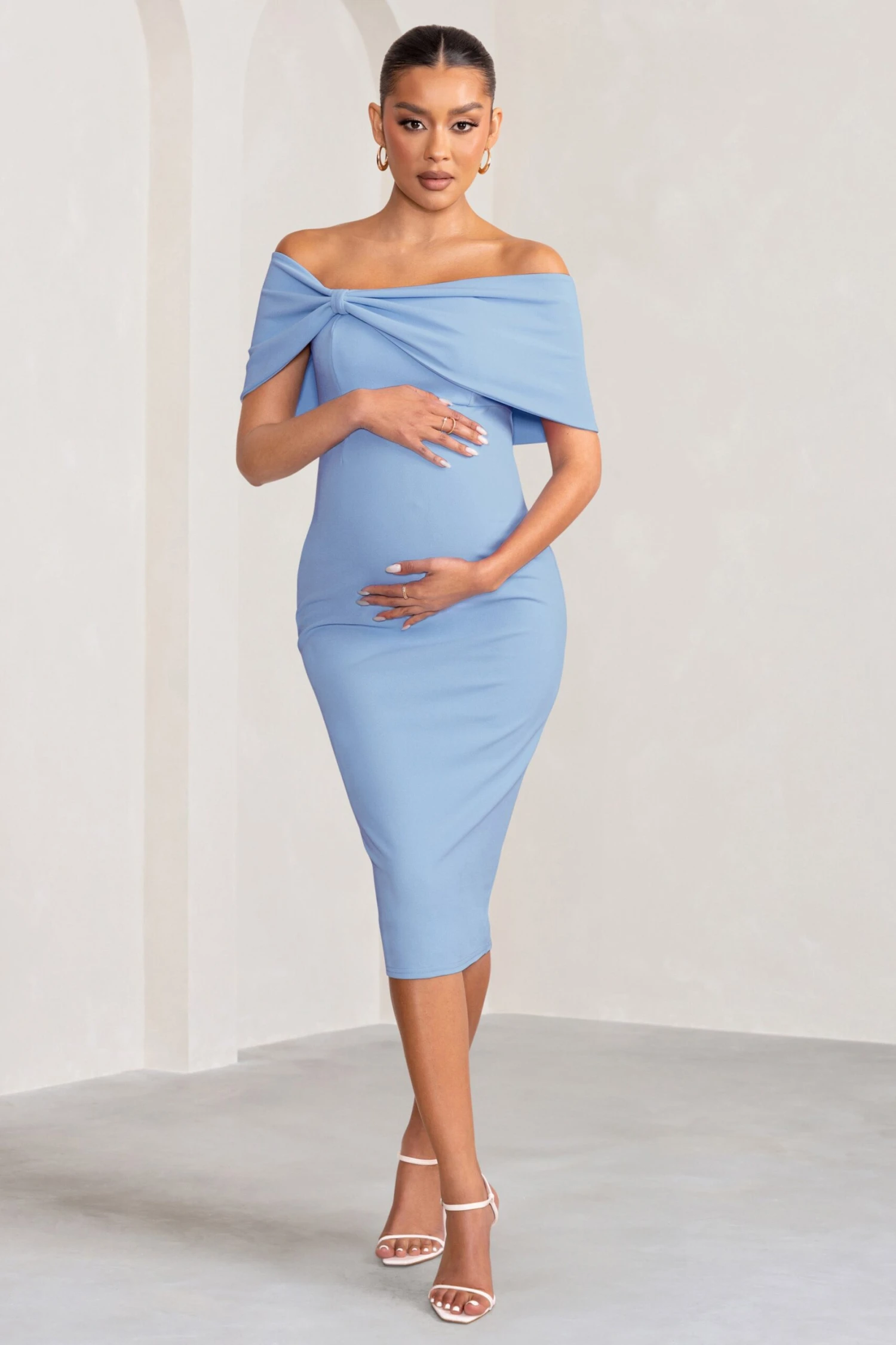 Meet Alyssa, our must-have midi dress made from a powder blue jersey that’s both supportive and sculpting. Sure to turn heads at any formal event from birthdays to baby showers, this blue maternity dress features a Bardot neckline wrapped by a large bow and a split fitted skirt.