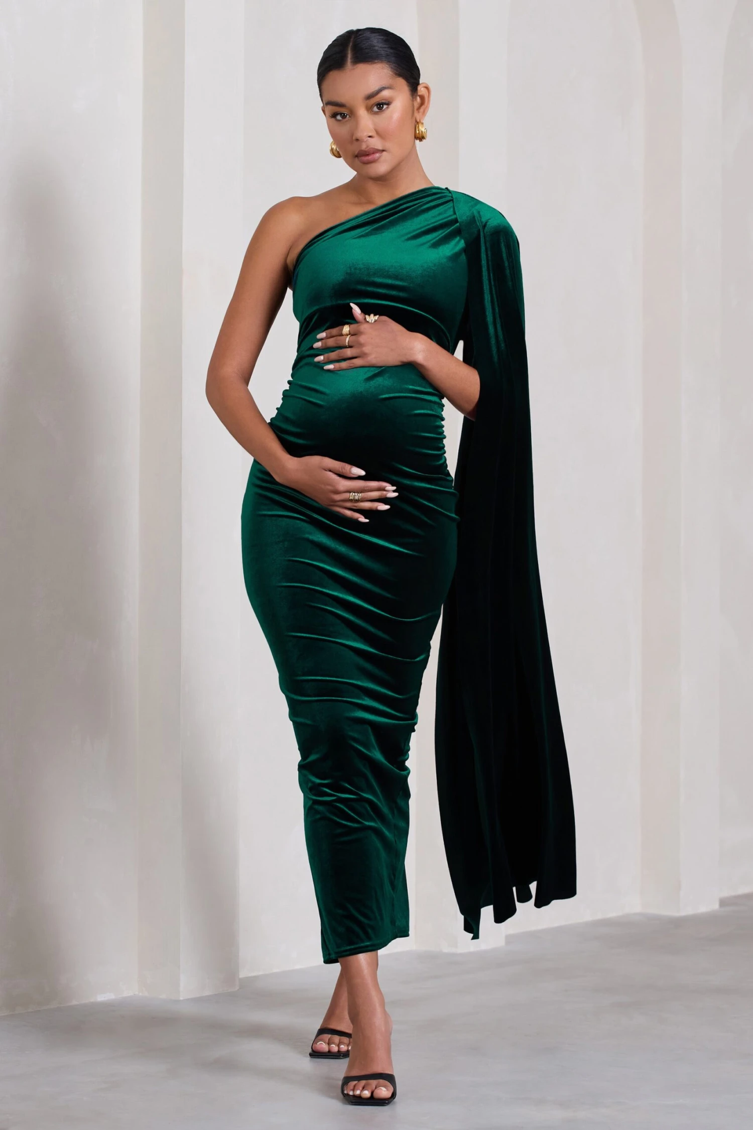 For a stunning maternity look that will always be remembered, take a look at our gracious Amaryllis gown. This green bodycon dress is made from a premium stretch velvet that’s partially-lined for comfort and support. Finished with a sweeping cape sleeve and a split skirt, this asymmetric maxi dress deserves a place in your maternity wardrobe.