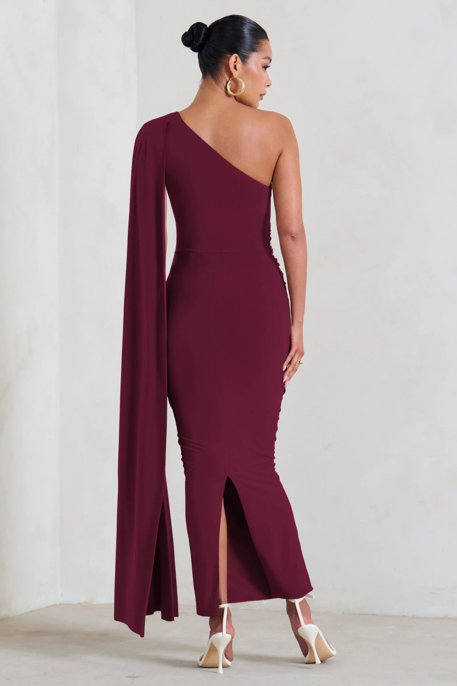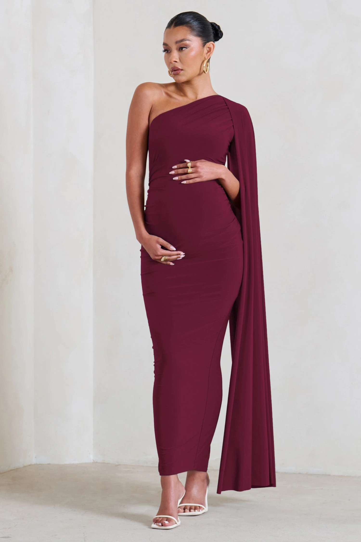 For a stunning maternity look that will always be remembered, take a look at our gracious Amaryllis gown. This burgundy bodycon dress is made from a premium stretch jersey that’s double-lined for comfort and support. Finished with a sweeping cape sleeve and a split skirt, this asymmetric maxi dress deserves a place in your maternity wardrobe.