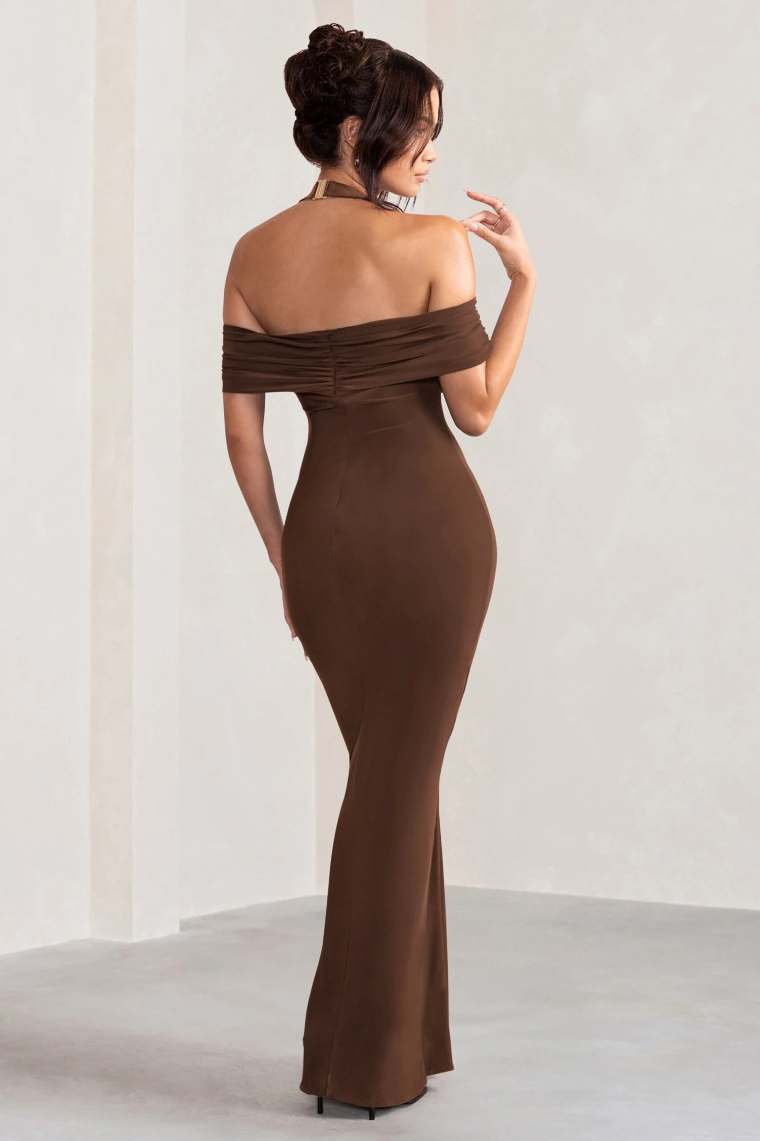 Anisa | Chocolate Brown Layered Halter Neck Bardot Maxi Dress With Thigh Split