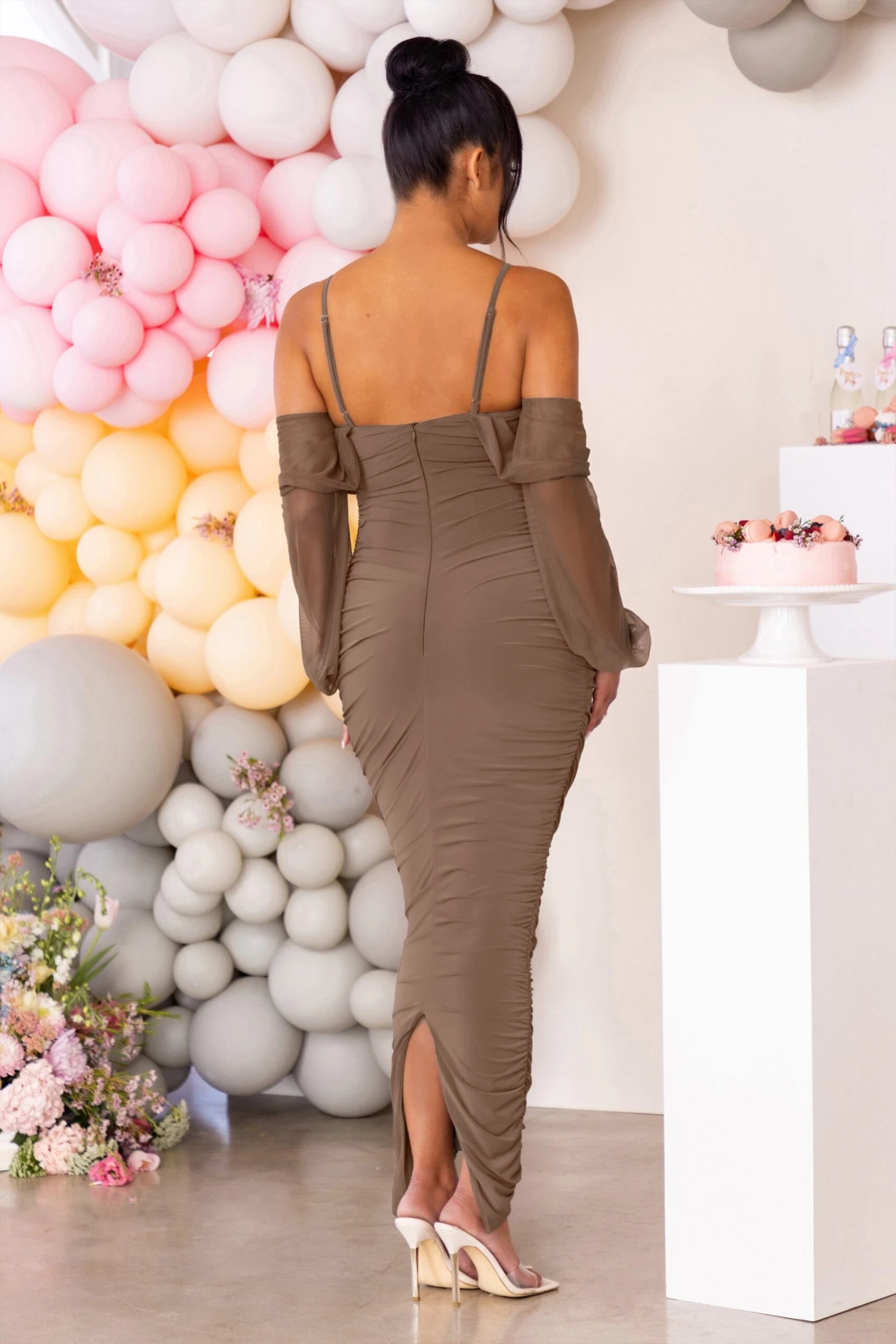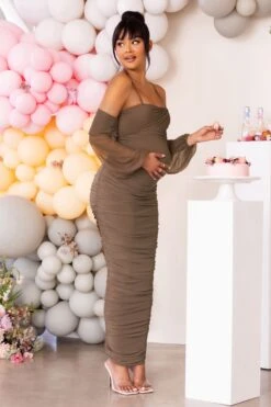 Sculpting stretch jersey and delicate mesh are carefully ruched to shape our mocha Announcement dress. Perfect for birthdays and blissful baby showers, this maternity dress boasts a strappy Bardot neckline with sheer voluminous sleeves that balloon gently at both cuffs. Pair this brown bodycon dress with simple accessories and let your silhouette be the statement.