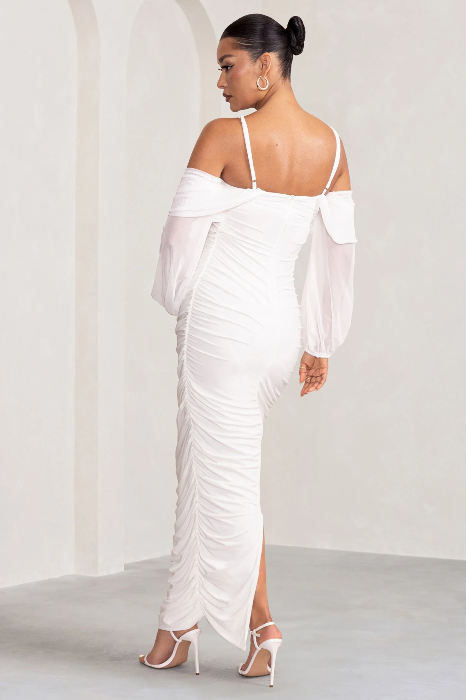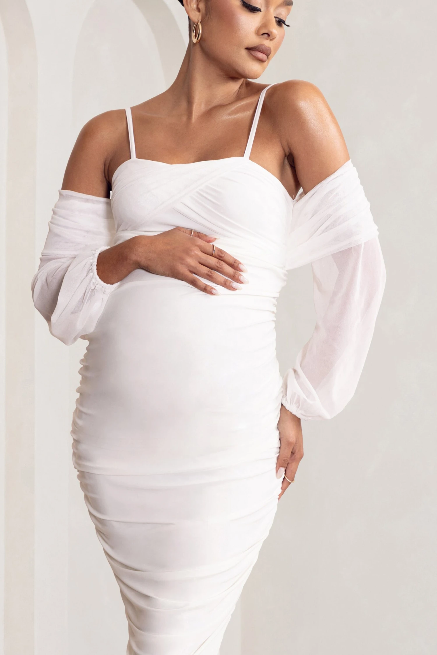 Sculpting stretch jersey and delicate mesh are carefully ruched to shape our off white Announcement dress. Perfect for birthdays and blissful baby showers, this maternity dress boasts a strappy Bardot neckline with sheer voluminous sleeves that balloon gently at both cuffs. Pair this bodycon dress with simple accessories and let your silhouette be the statement.