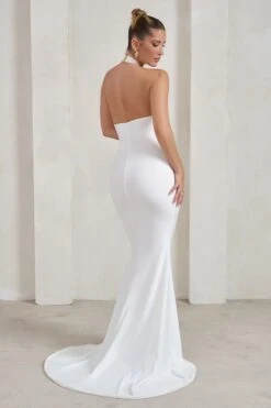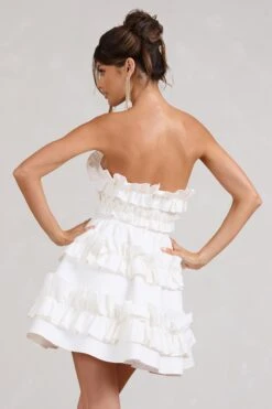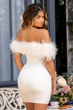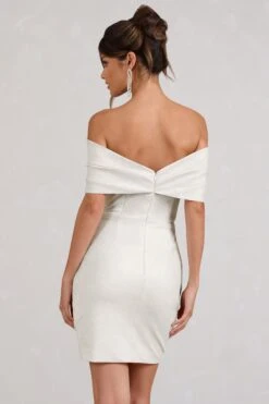 Celebrate your new summer curves in our must-have maternity dress, Aroma. Supporting your figure in a double-lined stretch jersey that’s then wrapped in a layer of soft ruched mesh, this white midi dress flaunts a Bardot neckline with long fitted sleeves carrying delicate ruffles. Where better to style this white bodycon dress than for an upcoming baby shower?