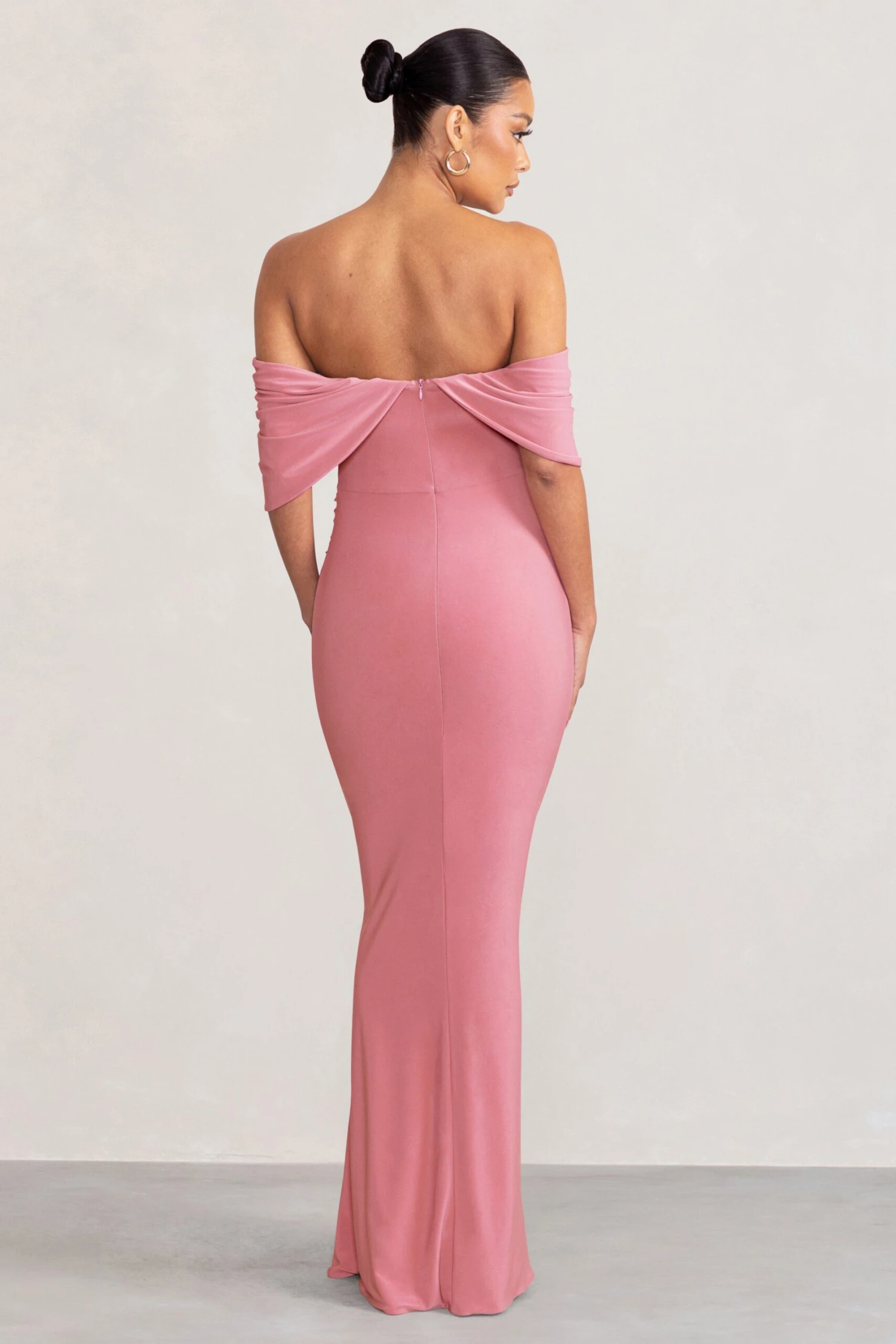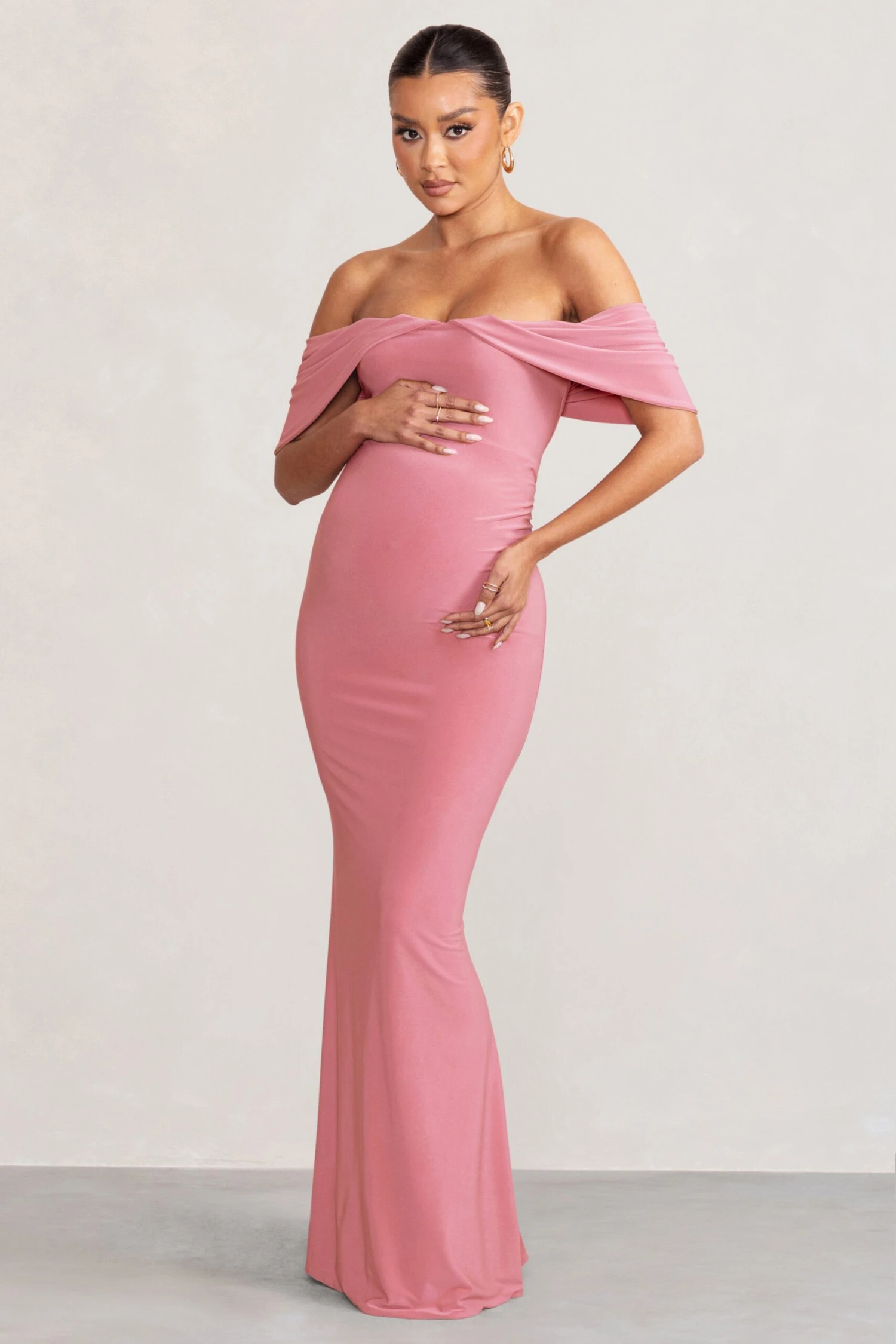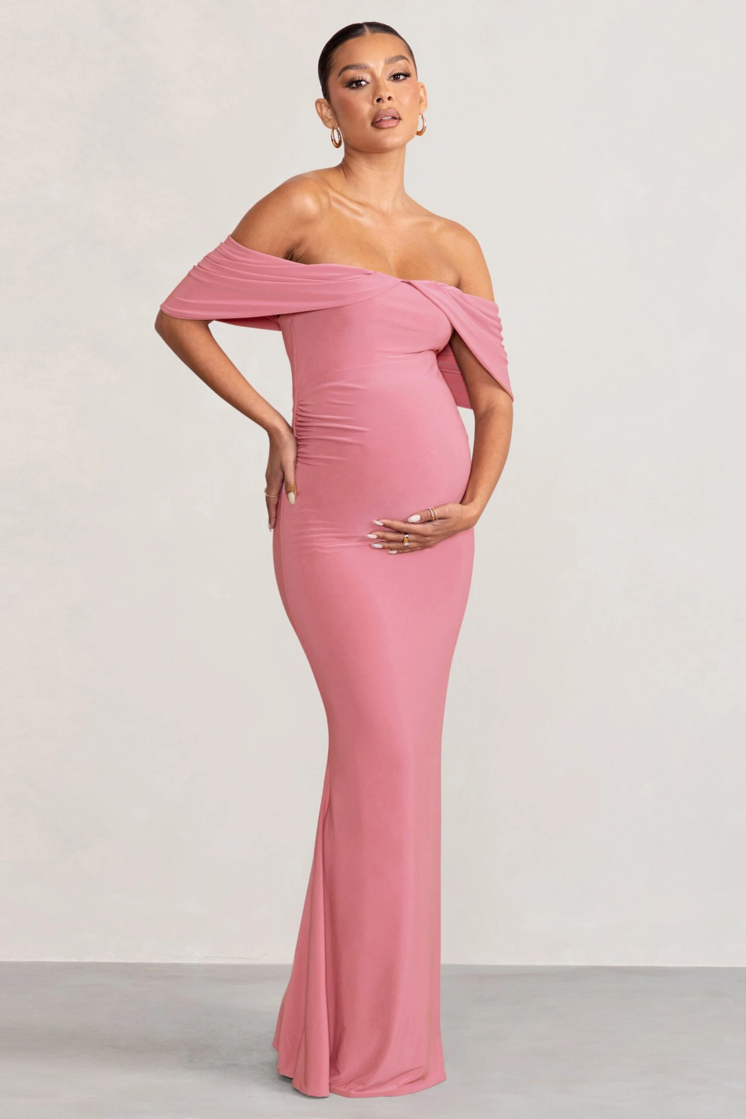 Sleek and sophisticated, opt for a high-impact look in Asha at your next event. Crafted in our signature double-lined jersey to contour and support your changing silhouette, feel confident when you step out in Asha. Featuring a draped Bardot sleeves and feminine neckline in a gorgeous blush pink hue, this floor-length dress will elevate your maternity wardrobe.
