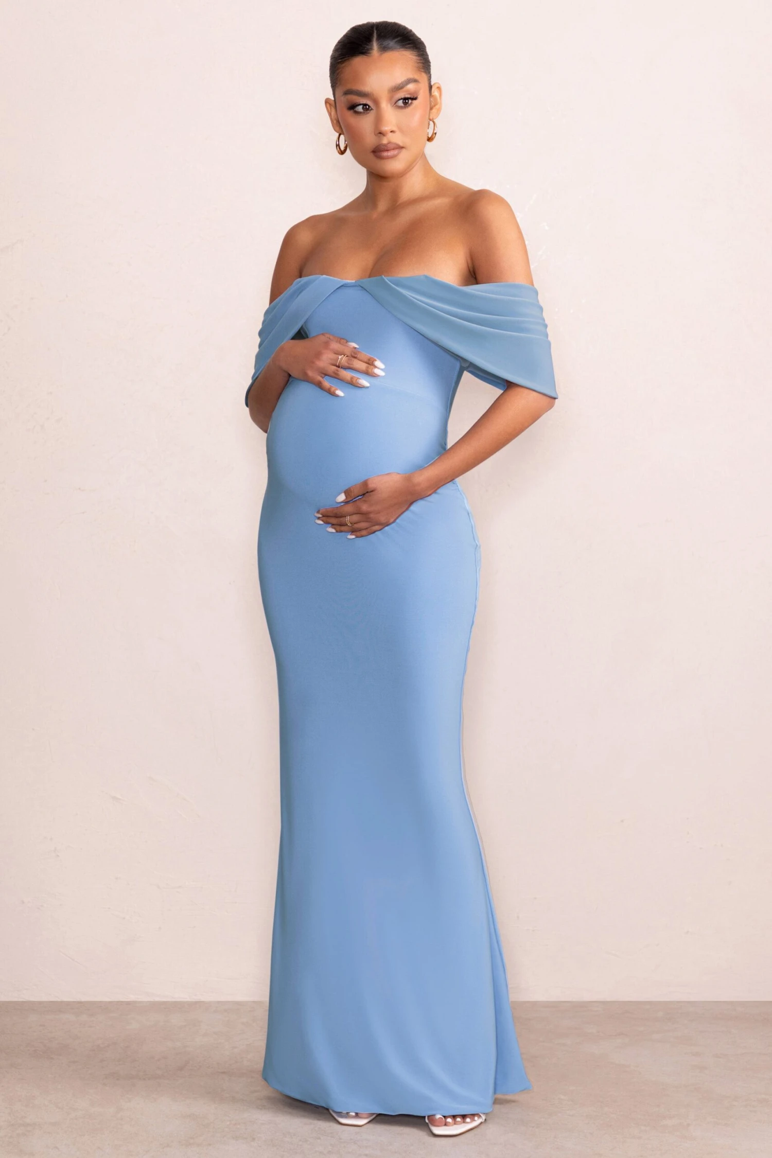 Sleek and sophisticated, opt for a high-impact look in Asha at your next event. Crafted in our signature double-lined jersey to contour and support your changing silhouette, feel confident when you step out in Asha. Featuring a draped Bardot sleeves and feminine neckline in a gorgeous powder blue hue, this floor-length dress will elevate your maternity wardrobe.