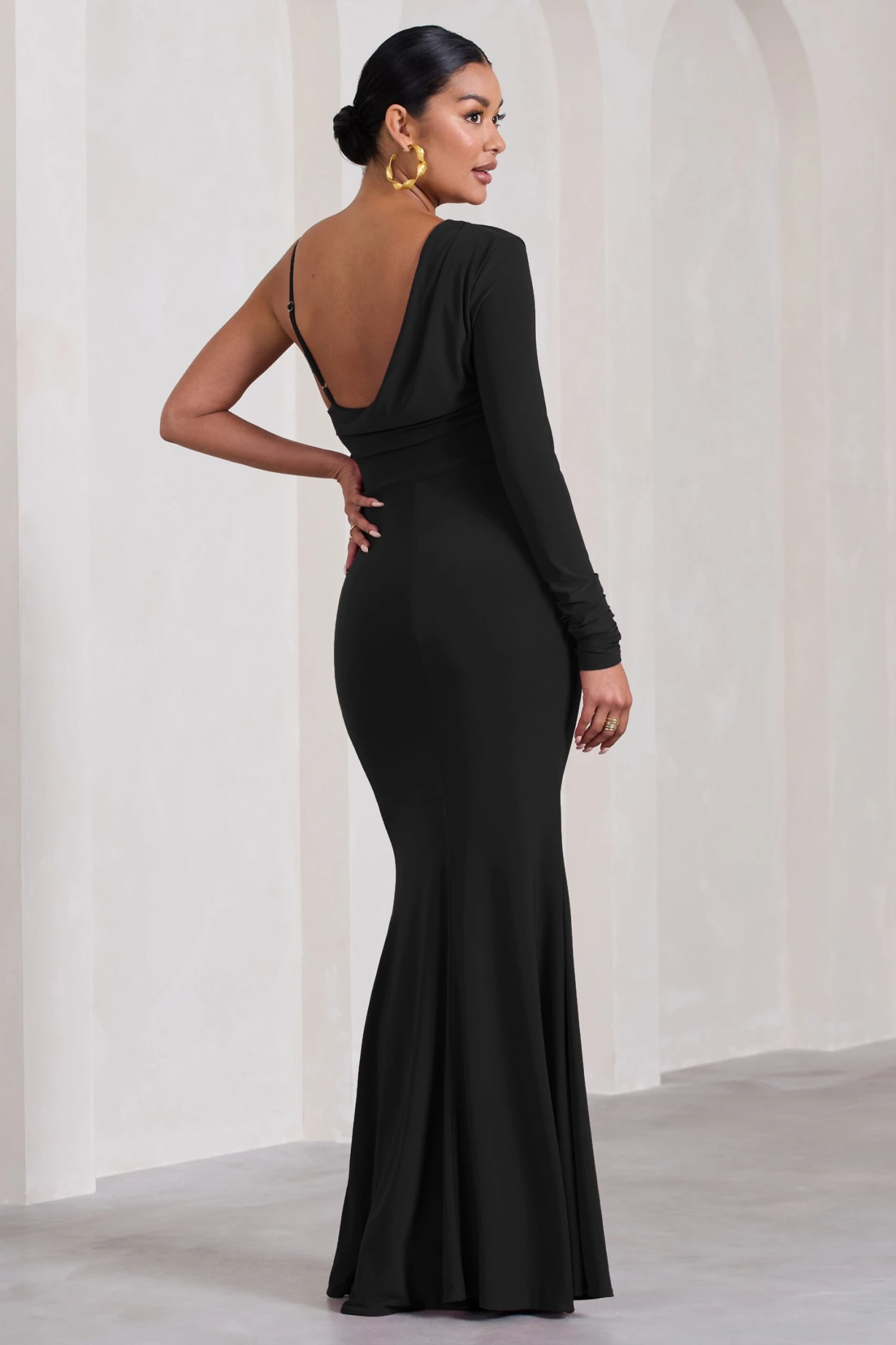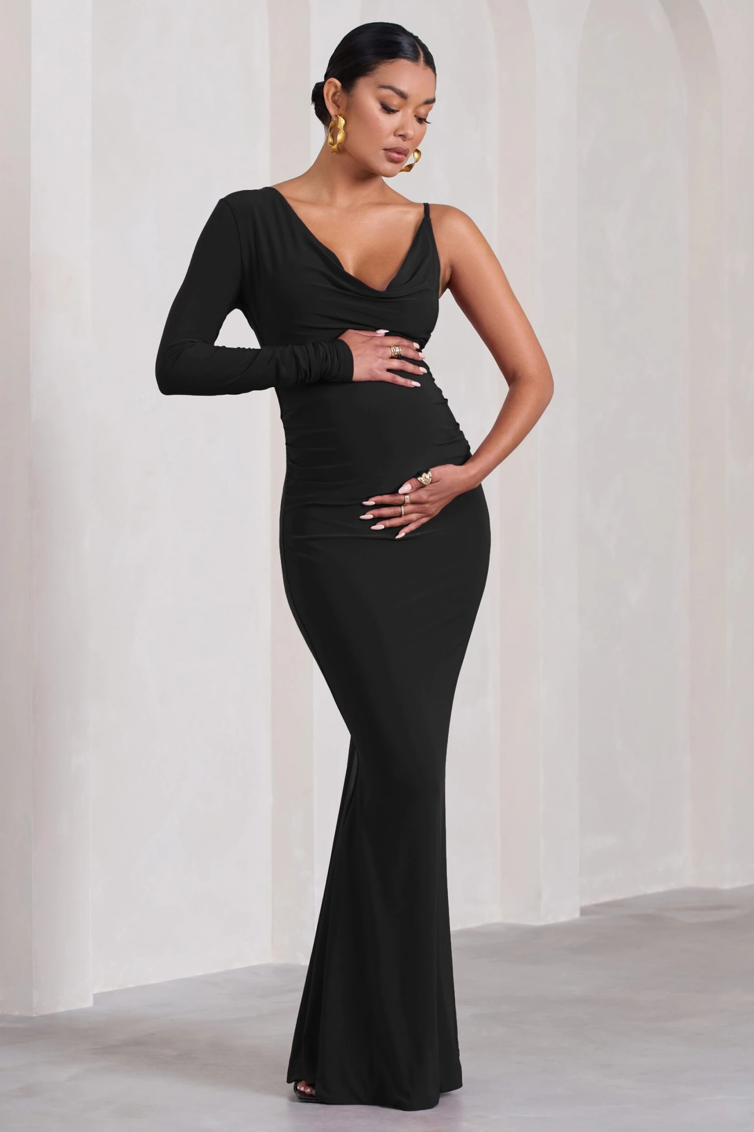 Compile a wardrobe of opulent pieces starting with At Dusk. Arriving in a classic black shade of our signature stretch jersey, this one-sleeved maternity maxi dress is detailed by an effortless cowl neckline and fishtail skirt. Try styling this floor-sweeper with some strappy stilettos for the perfect black tie ensemble.