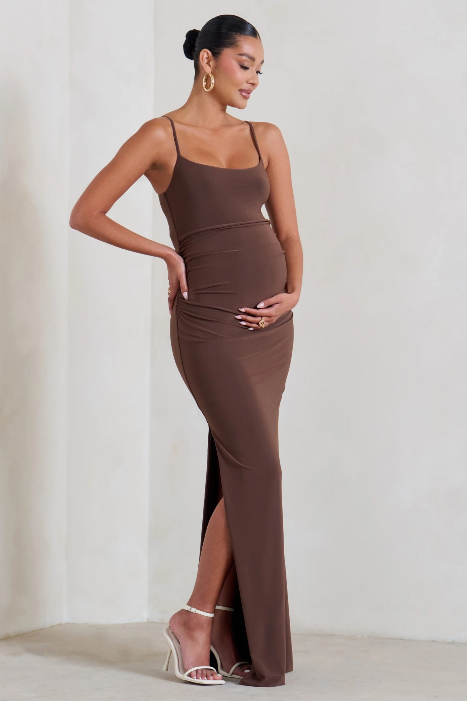We believe the best time to showcase your body is when you’re expecting and our latest maternity dress Aurelia is a fine way to do so. Designed in sculpting stretch jersey, this chocolate brown bodycon features slim cami straps and a split to the side of its full-length skirt.
