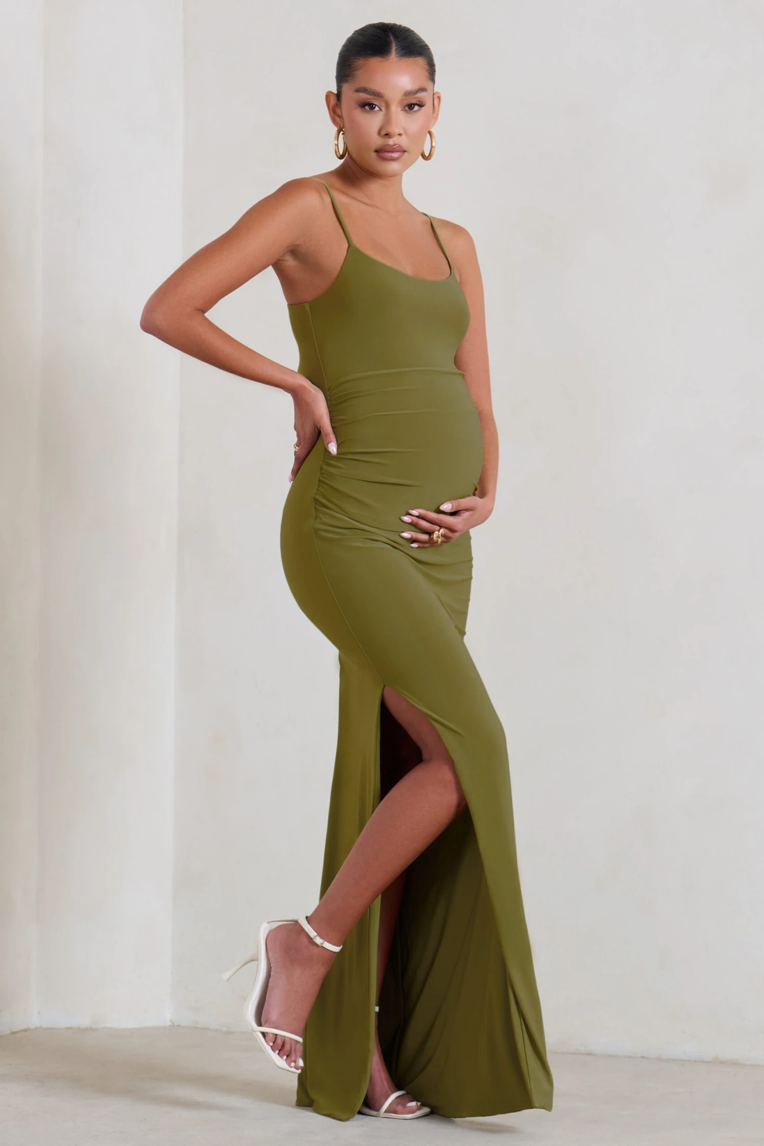 We believe the best time to showcase your body is when you’re expecting and our latest maternity dress Aurelia is a fine way to do so. Designed in sculpting stretch jersey, this olive green bodycon features slim cami straps and a split to the side of its full-length skirt.