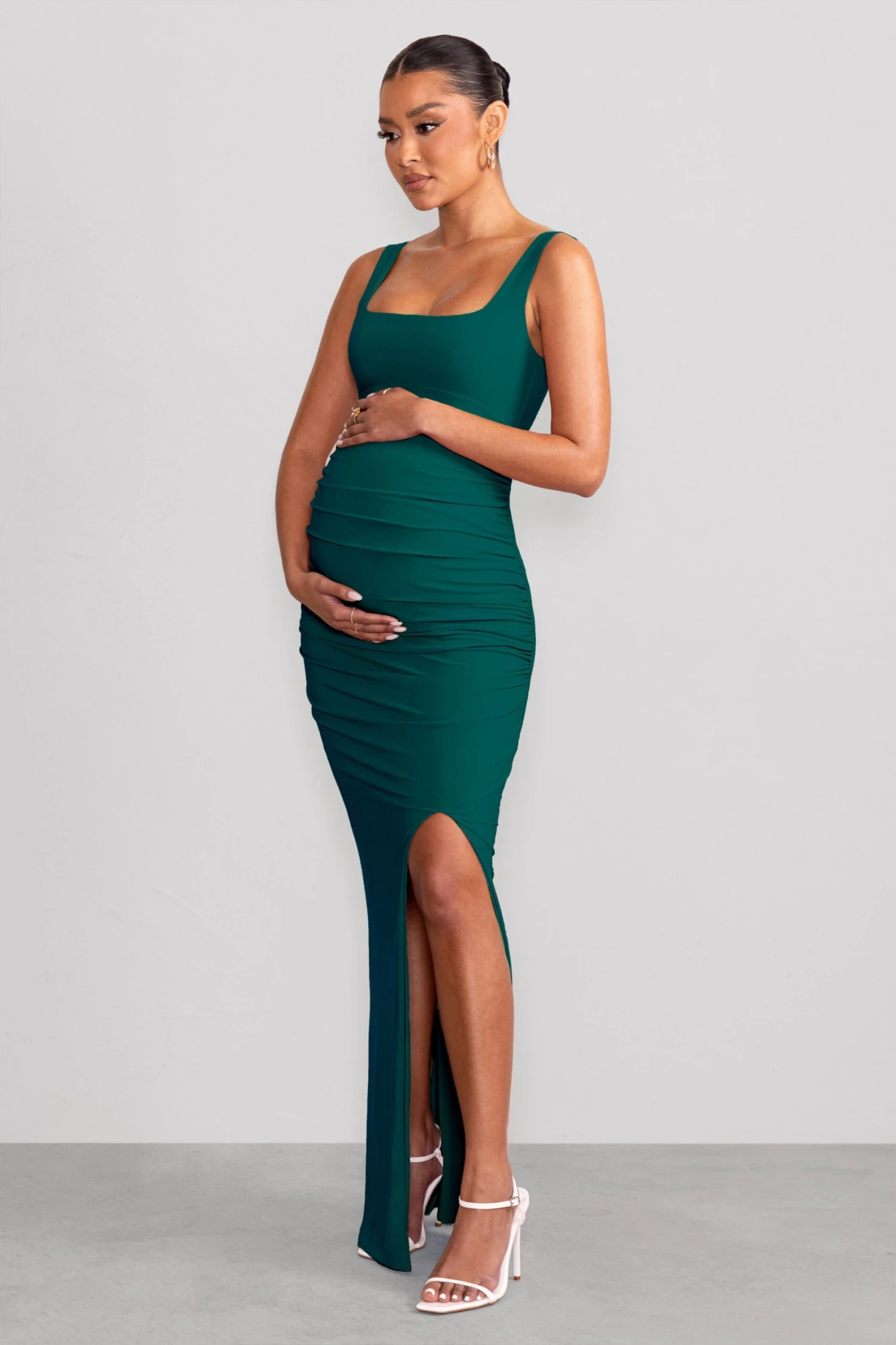 Showcase your bump at that upcoming baby shower in our figure-framing Avril maxi dress. Designed in a bottle green shade of our signature stretch jersey, this maternity maxi dress features a square neckline with wide shoulder straps and a split full-length skirt. Finish Avril with a pair of diamond earrings like our statement Corina hoops.