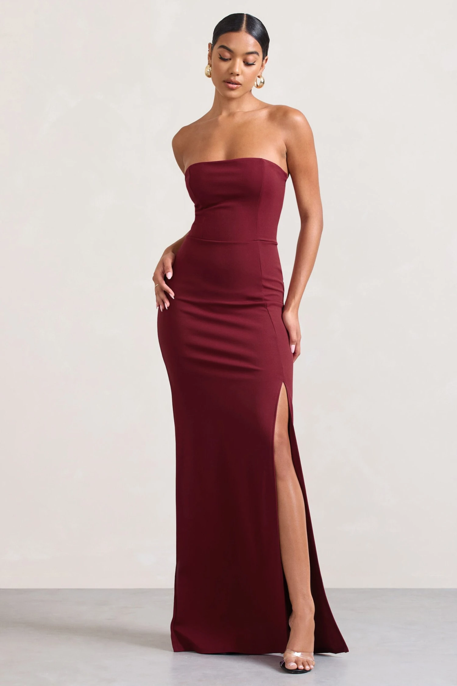 _Leave it to Club L to make a sleek dress suited to every special occasion. Cut from sculpting scuba crepe, our berry Belle of The Ball maxi boasts a bodycon fit with a strapless bandeau neckline and a theatric thigh split. If you’re looking for a figure-flattering wardrobe staple to see you through the party season, look no further than this timeless style.