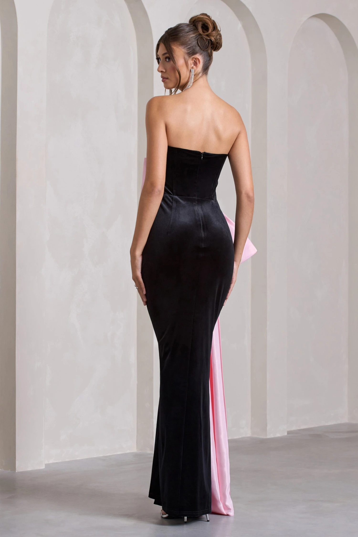 Best Wishes | Black Velvet Bandeau Split Maxi Dress With Oversized Pink Bow