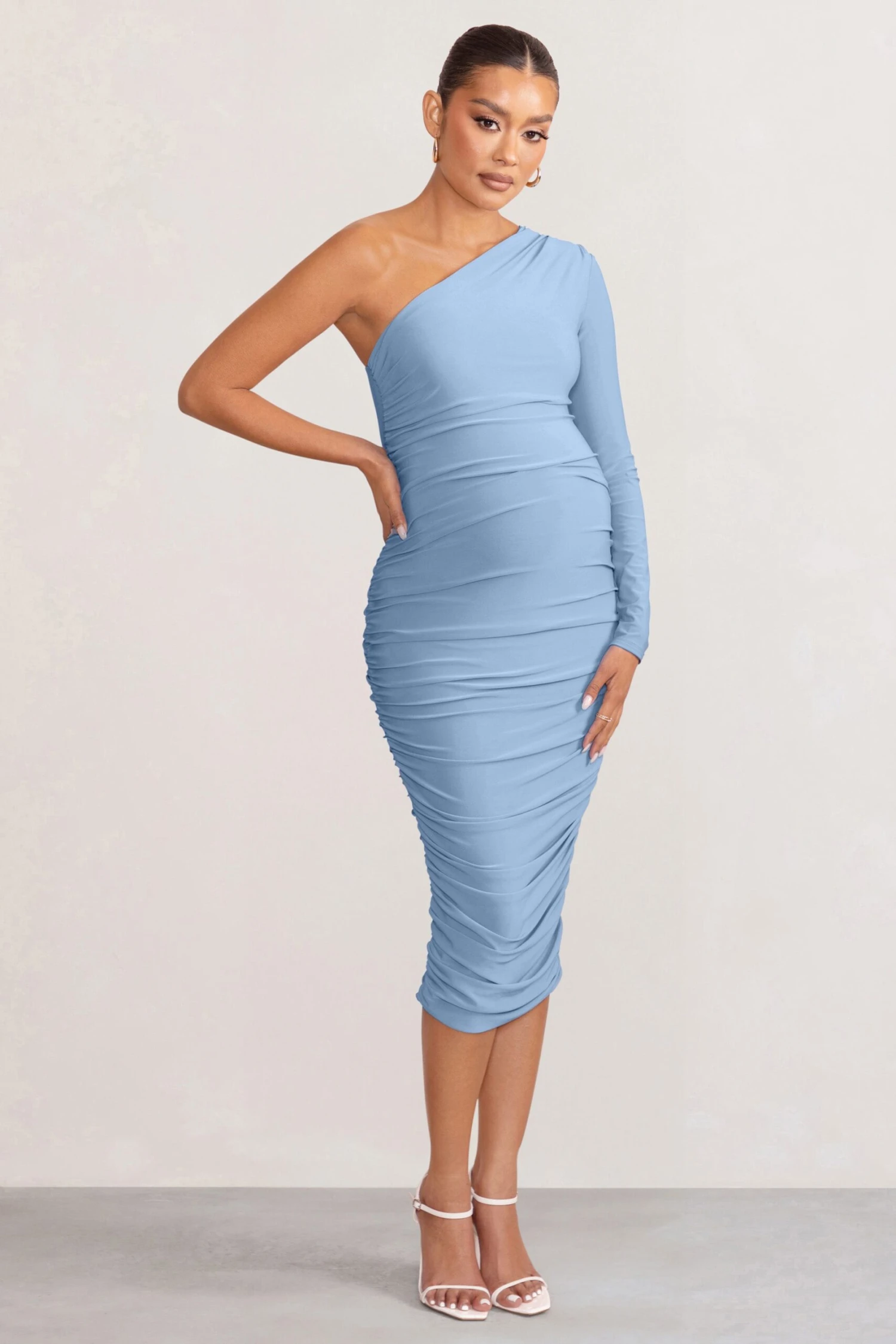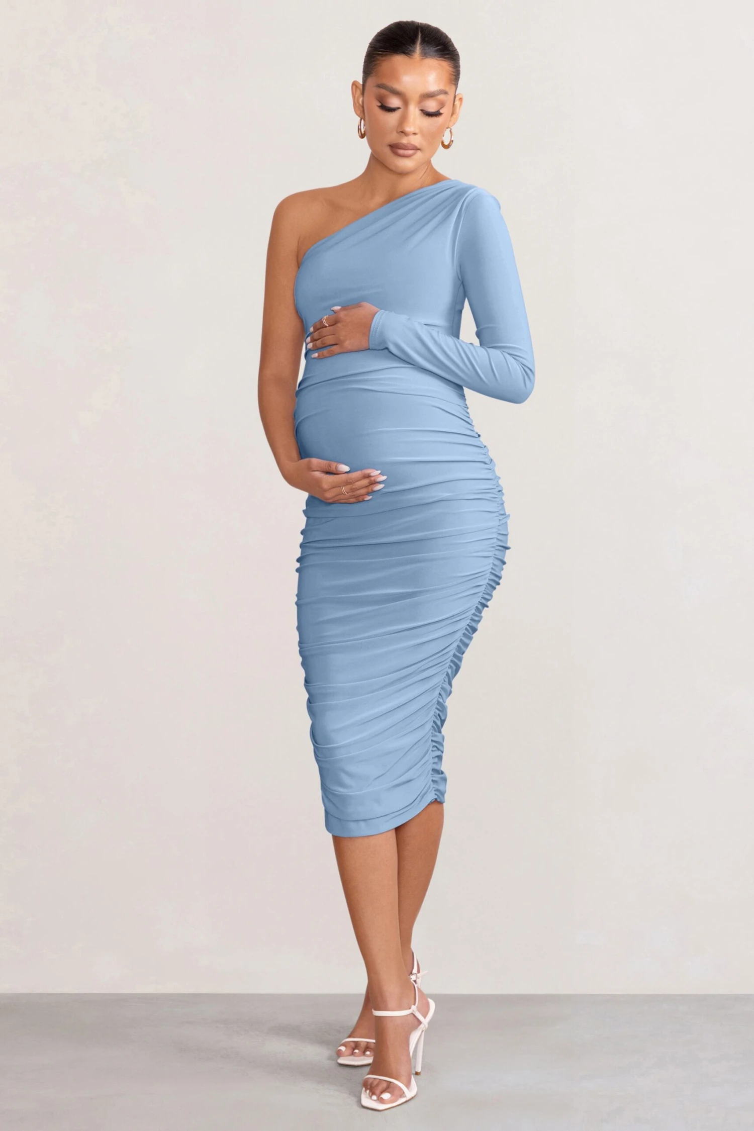 Make a glamorous statement in Betsy, our gorgeous midi dress in a beautiful powder blue. Crafted in our signature double-lined jersey, this dress will contour your silhouette and accentuate your curves. Featuring an asymmetric neckline with a one-shoulder long sleeve and full body ruching, this dress is guaranteed to turn heads at your next event and is a staple for your maternity wardrobe.