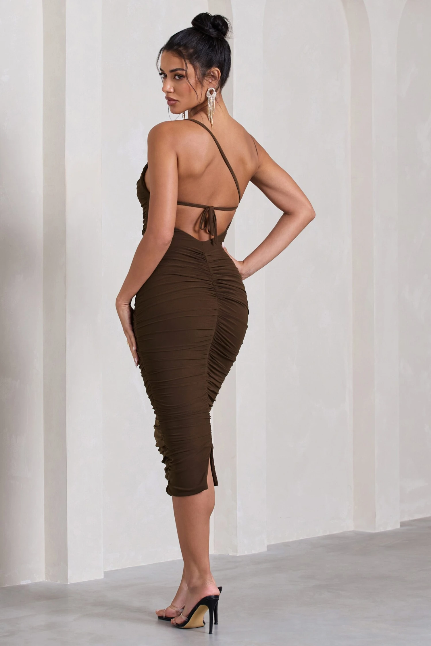 Bree | Chocolate Ruched Mesh Strappy Bodycon Midi Dress