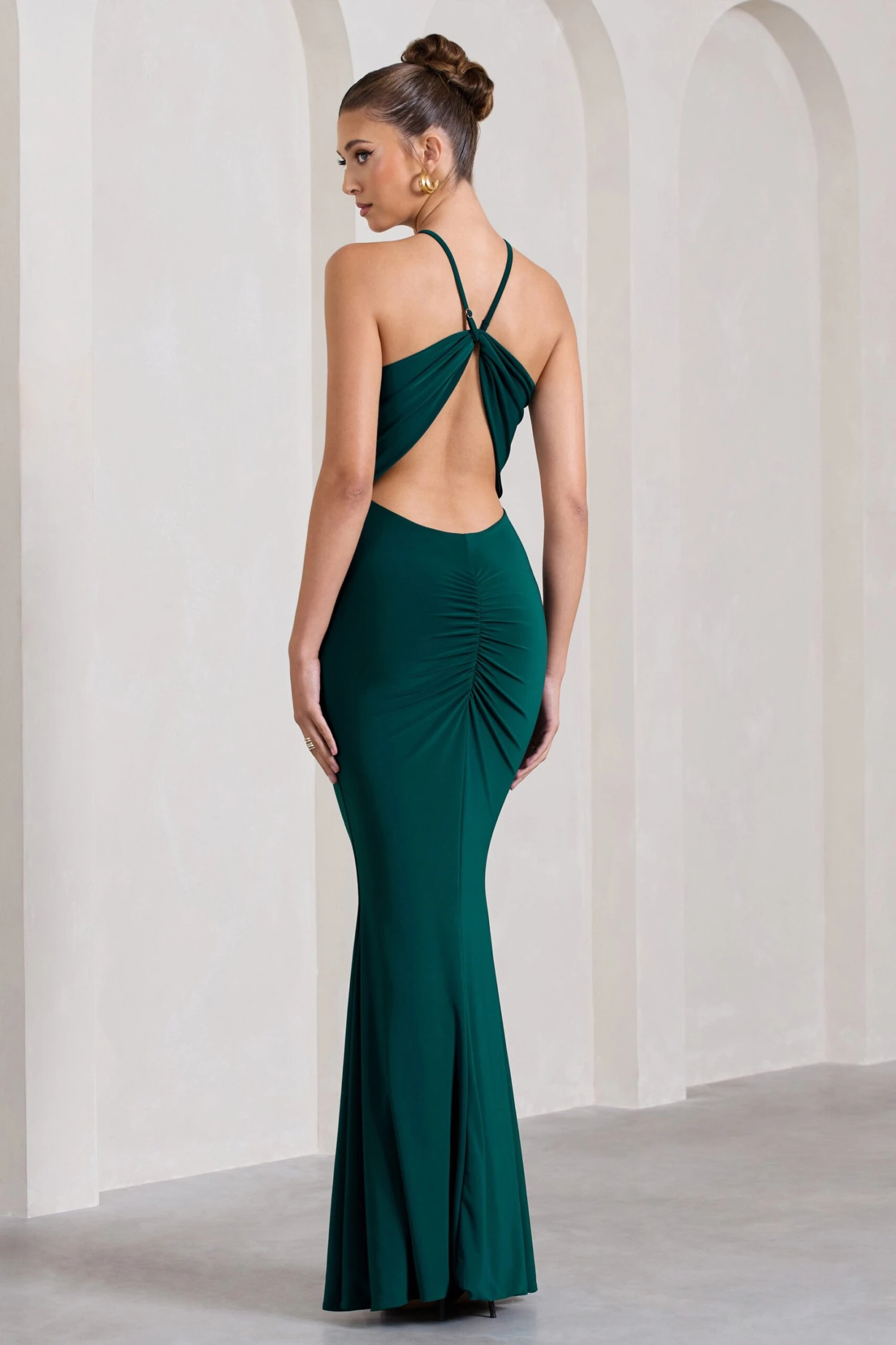 Defined by an irresistible open-back, Brianna puts a contemporary twist on this otherwise timeless silhouette. This halter-neck maxi dress arrives in a rich green shade of our signature stretch jersey, renowned for its figure-sculpting capabilities. For an elevated wedding guest look, try complimenting Brianna with gold accents.