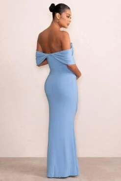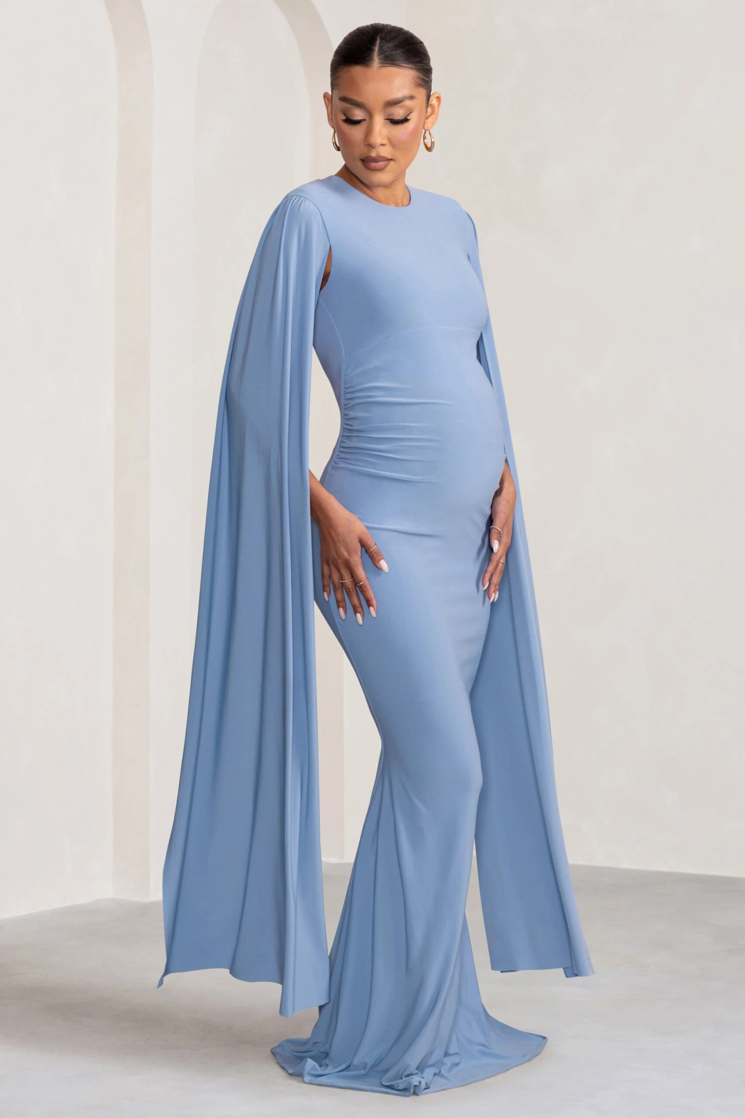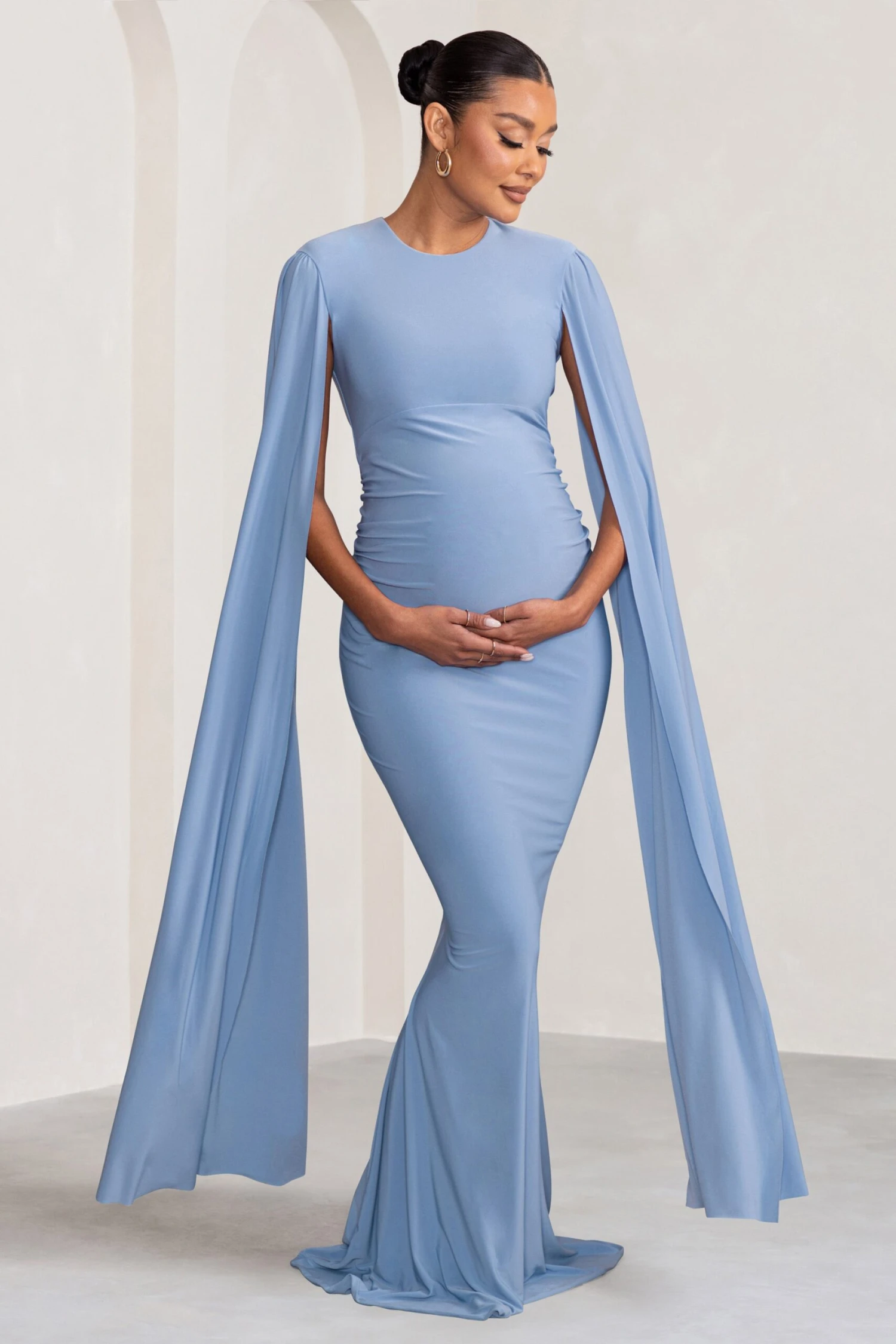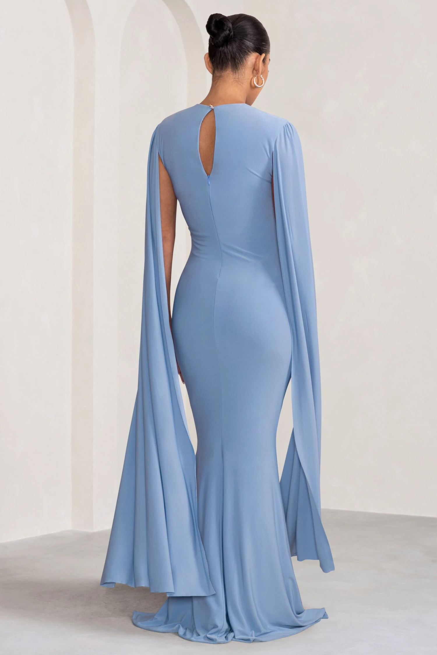 Make a statement in Briony, our gorgeous maxi dress in a beautiful powder blue hue. Crafted in our premium jersey fabric, this dress will skim your silhouette and accentuate your curves. Featuring a high neckline and dramatic floor-length cape sleeves, Briony is guaranteed to turn heads at your next event.