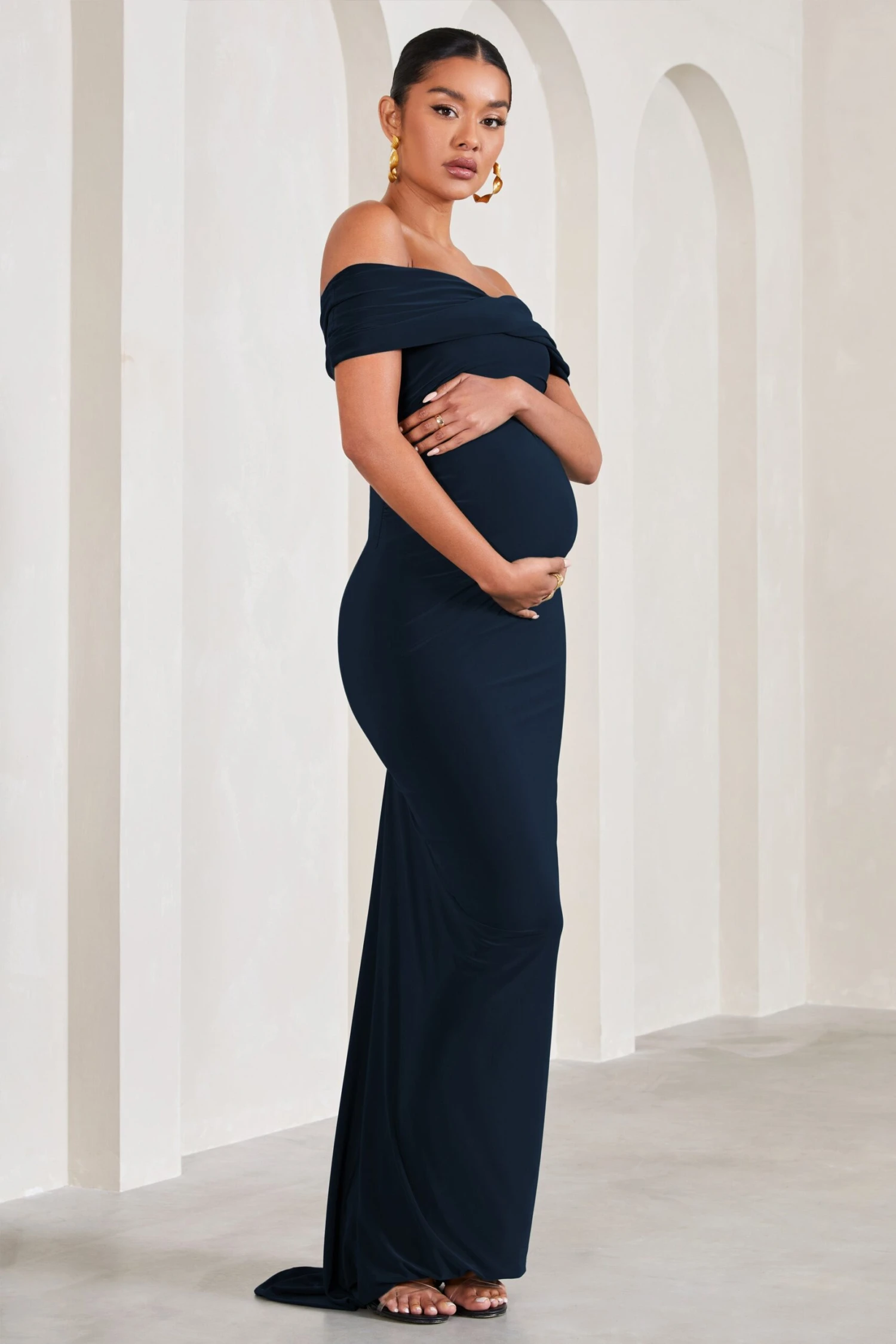 Meet Carmen, the epitome of effortless elegance. Designed in a premium stretch jersey, this navy maternity maxi was made with your comfort at the forefront. Carmen is framed in a sophisticated silhouette, defined by its godet-inspired drape and opulent bardot neckline. For an elevated black tie look, pair this piece with some strappy stilettos and diamanté earrings.