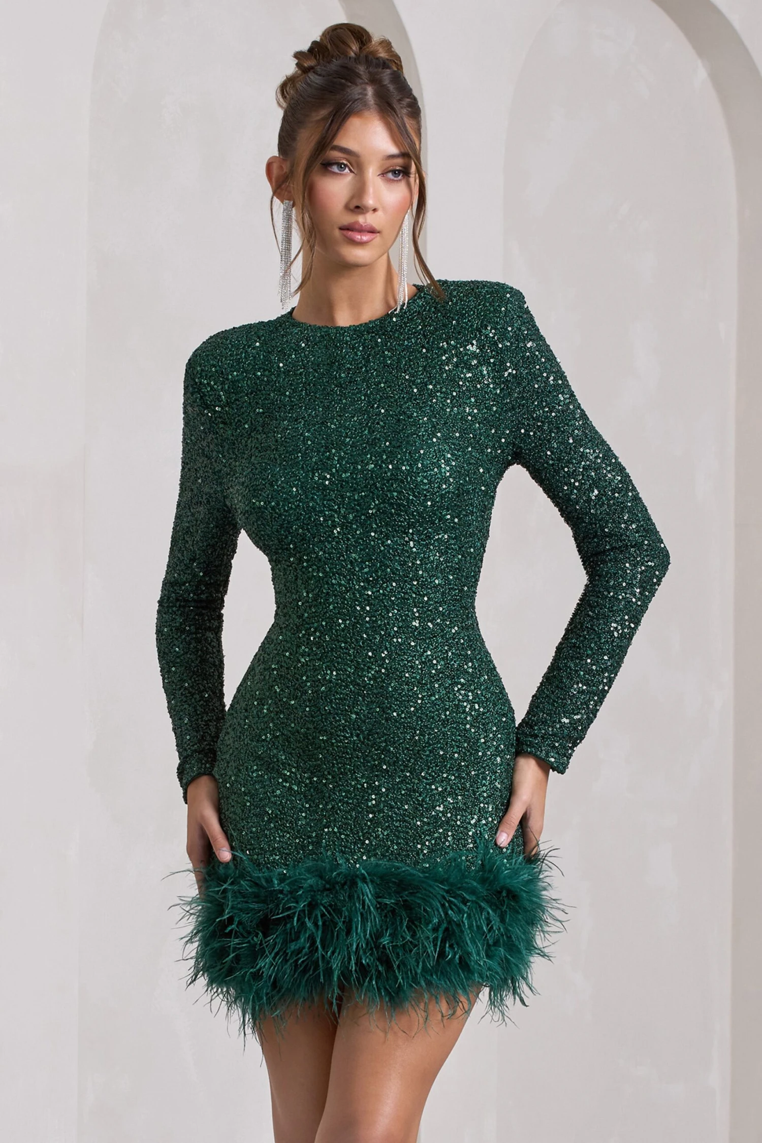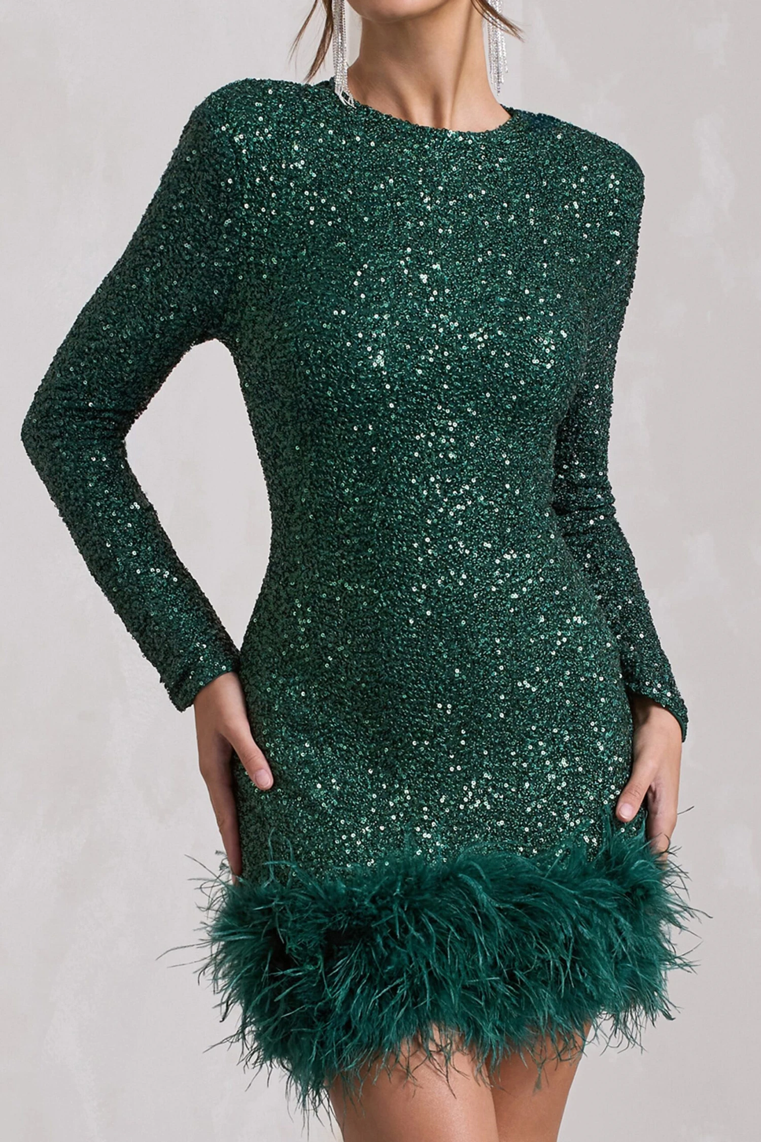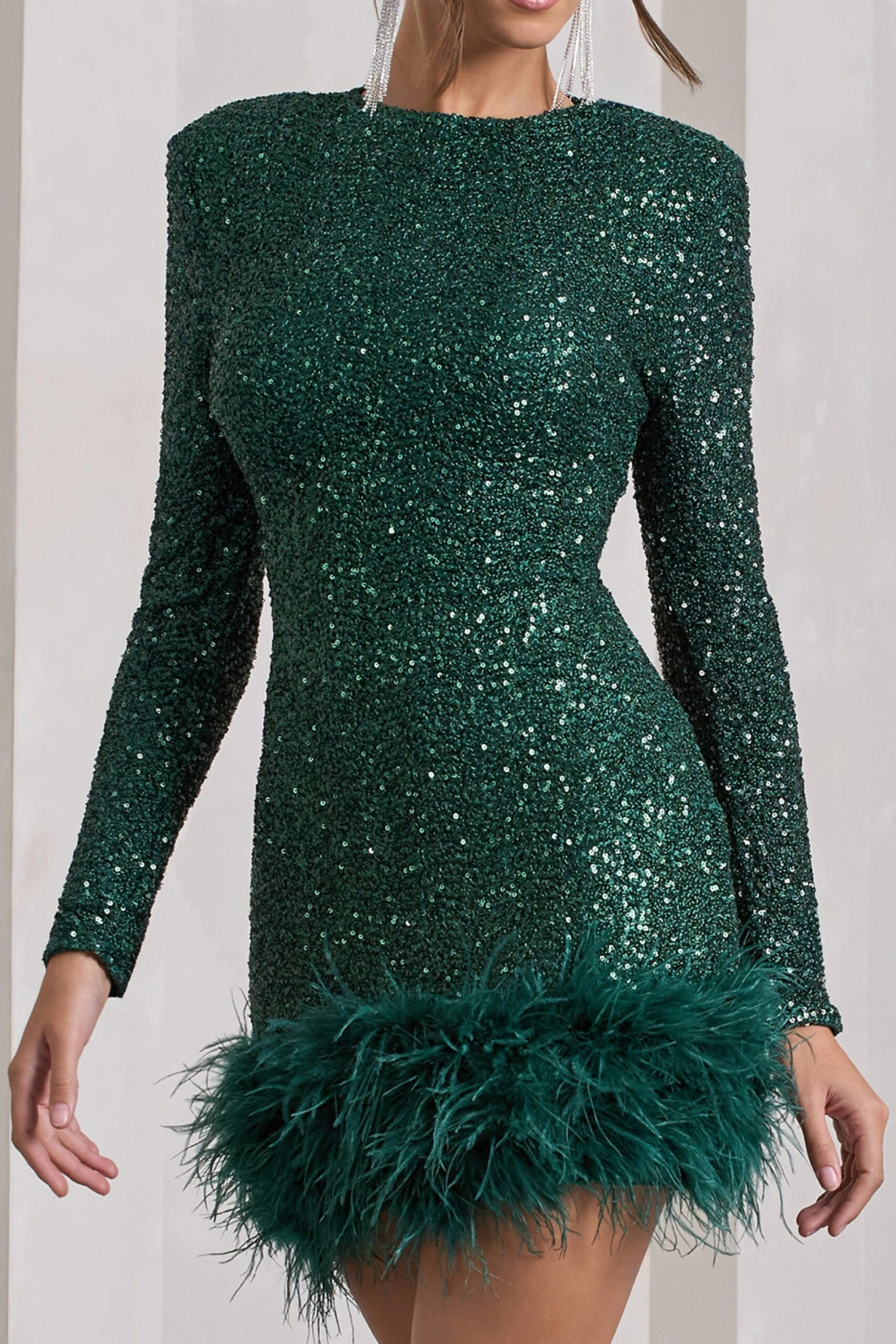 With so many sparkling sequin embellishments, our Claudia is truly a party season must-have. The bottle green dress features a high neckline and long sleeves with padded shoulders to exaggerate your curves. Making this mini dress all the more memorable are the feathers tickling its short hemline.