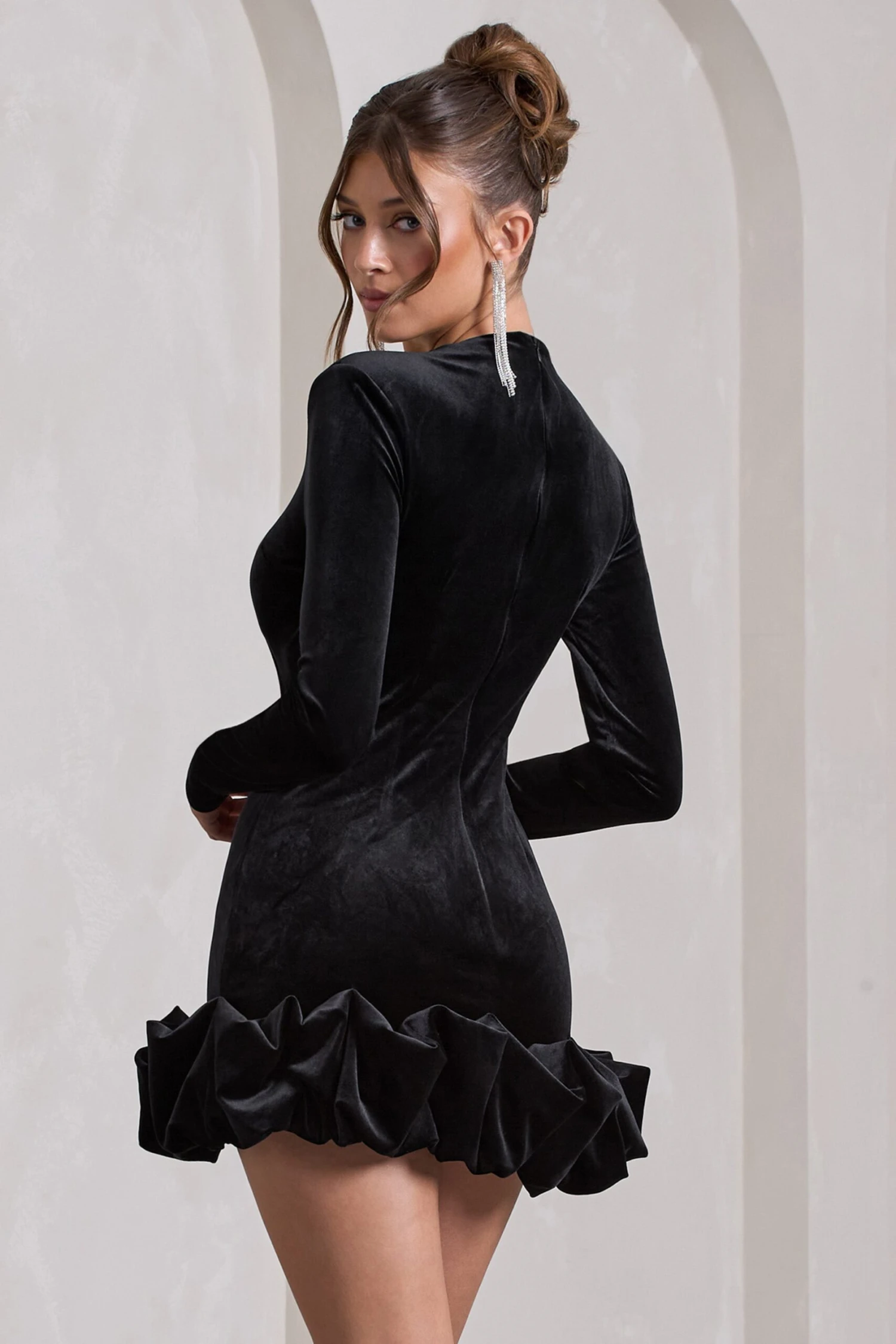 Opt for opulence at your next social event in our black mini dress, Claudine. Crafted in our signature stretch velvet, this long-sleeved bodycon is characterised by an extravagant display of ruffles along its hemline. Keep Claudine at the forefront during your next birthday soiree by pairing it with a sleek bun and gold accents.Â