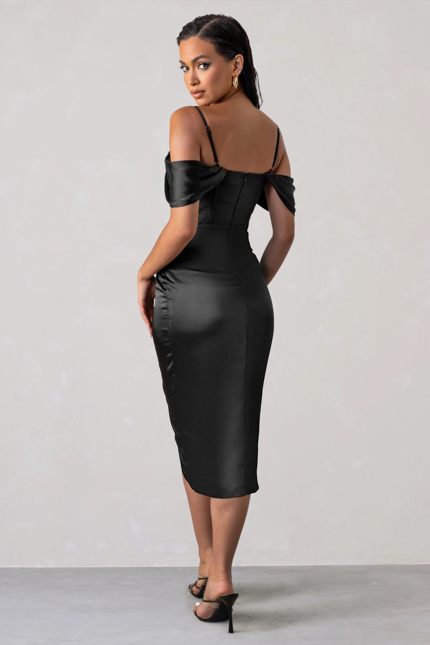 Deserving | Black Satin Bardot Sleeve Corset Wrap Midi Dress