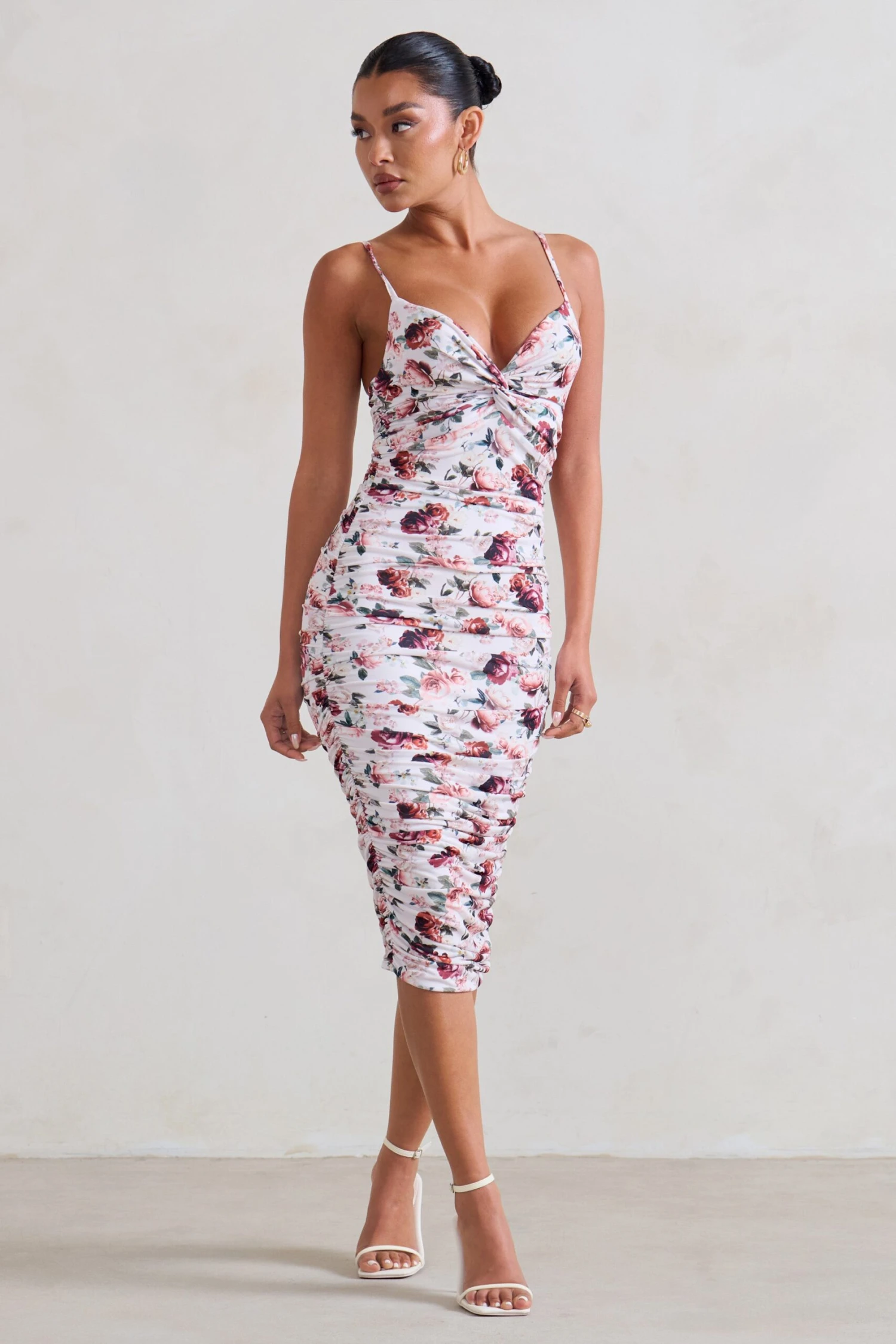 Give your wardrobe the refresh it deserves with our white floral favourite, Desired. Perfect for evening cocktails or a bottomless birthday brunch, this dress arrives in a sweetheart silhouette with slim straps, a twisted knot detail and ruching that brings attention to your curves. Pair this printed midi dress with strappy heels for a minimal look with maximum impact.