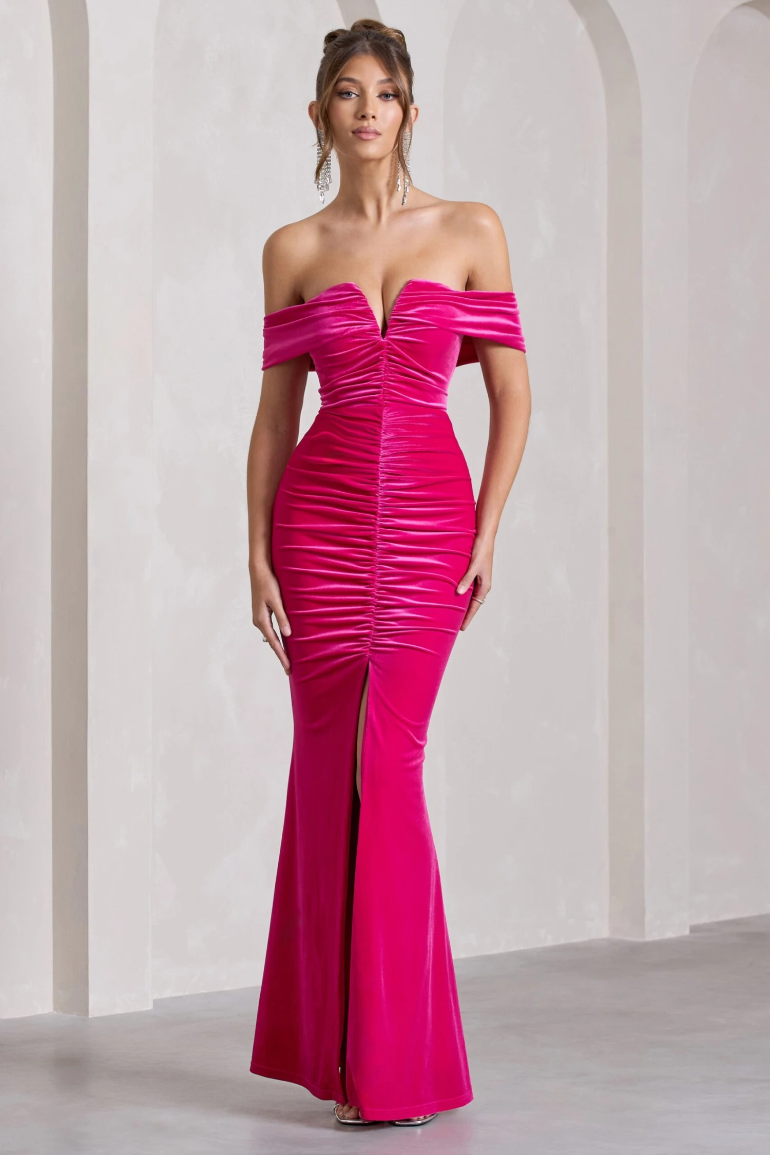 Bold in both design and colour, Divinity was made for high impact. Crafted in a luxurious pink velvet, this ruched maxi dress boasts a bardot neckline highlighted by a sculpting wired v detail. Perfect for any black tie occasion, Divinity is flourished with a fishtail skirt and centre split.Â