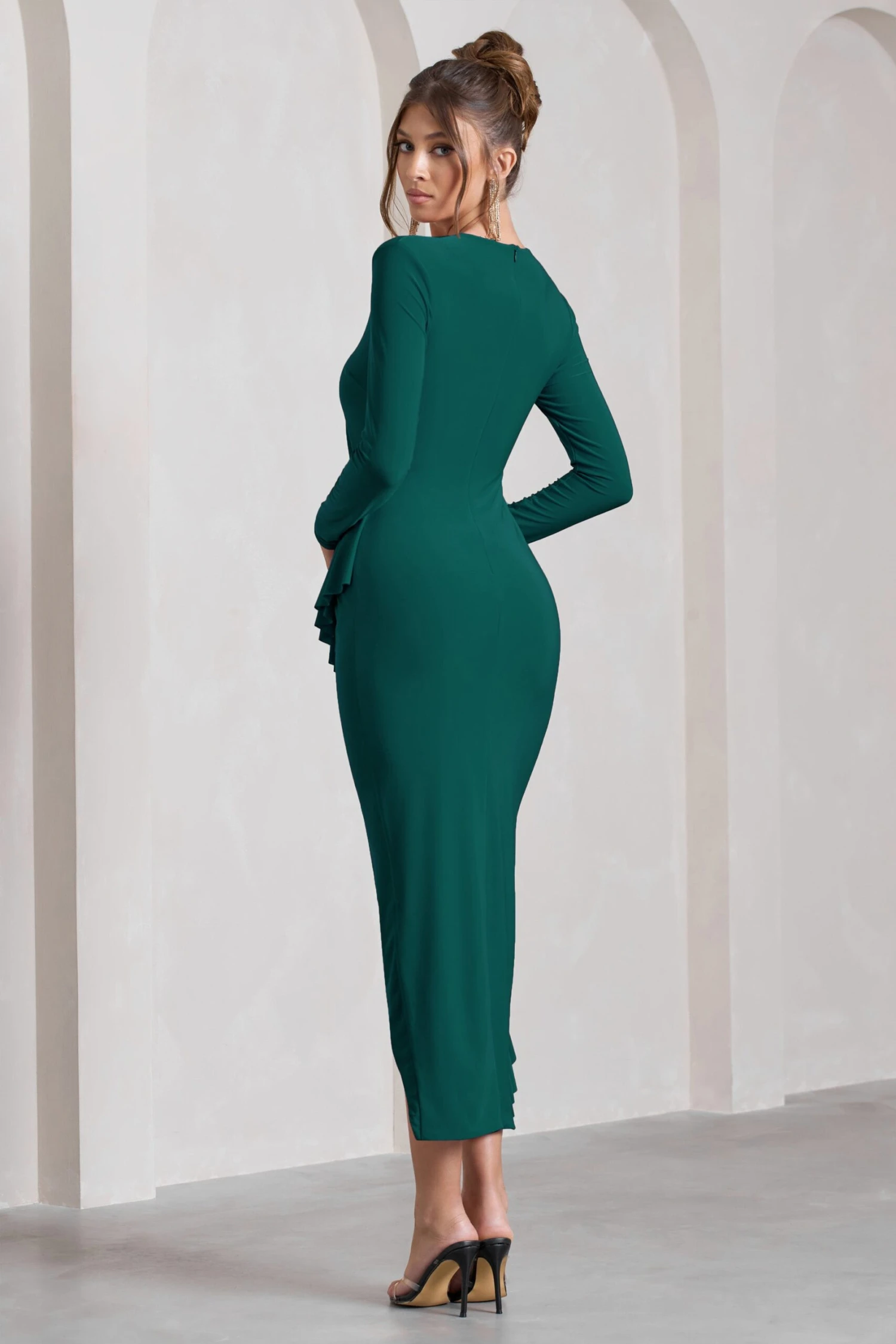 Whether its a wedding soiree or date night, exude a romantic state of mind in our green midi dress, Dolce Vita. Crafted in a sophisticated silhouette of our signature stretch jersey, this timeless style is elevated by an asymmetric hemline traced with an artful display of ruffles. Compliment this bottle green maxi by teaming yours with some diamante accents during your next event.Â