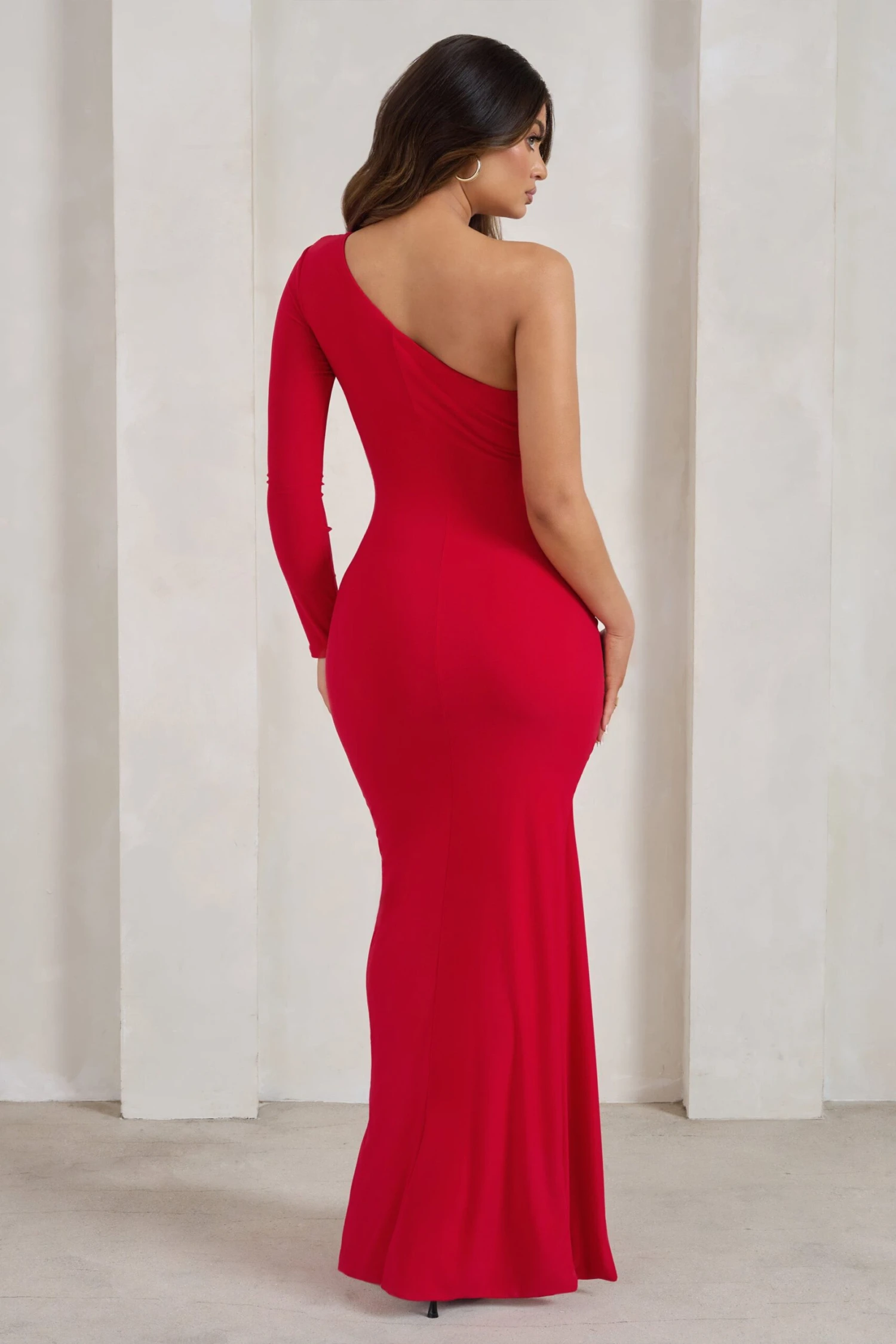 Whether you’re attending a wedding or an extravagant engagement, Doll is the maxi dress to truly be remembered. Luxuriously crafted from vibrant red jersey with stretch and ruching to contour your curves, this formal wardrobe staple features an asymmetric neckline, a single long sleeve and a statement hem split. Pair our Doll with delicate jewellery and let your fine silhouette be the focus.