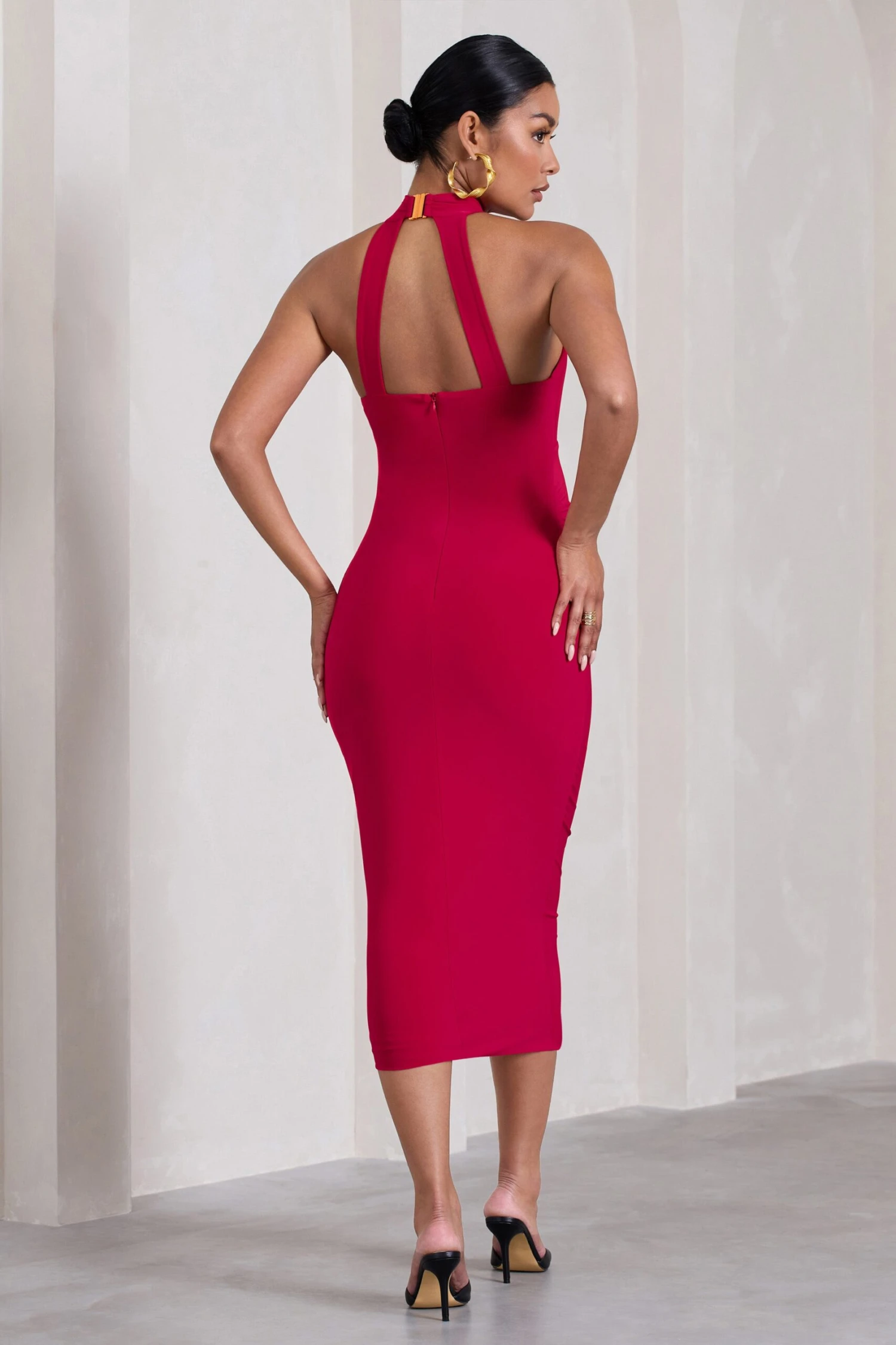From weddings to dinner dates, Dora was made to see you through any occasion. Crafted in a timeless design of our signature stretch jersey, this red maternity midi dress features a gathered halter neckline, figure-hugging silhouette and subtle bump ruching. Try complimenting Dora‘s rich red tone with some gold accents at your next event.