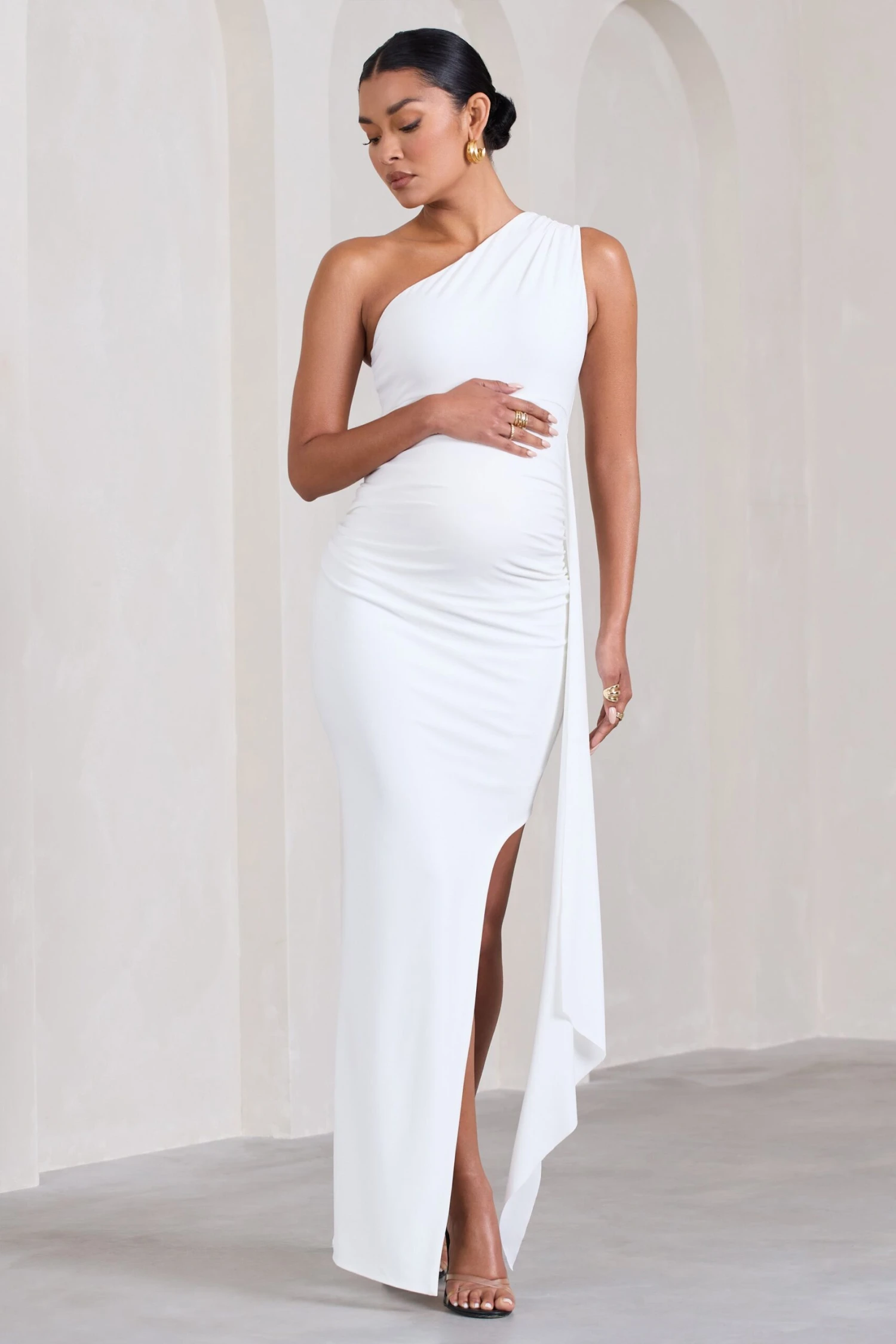Embrace your growing figure in a captivating dress like Dream Of You. Perfect for baby showers and gender reveal events, this white maxi dress is elevated by an eye-catching drape and side-split. Completed with an asymmetric neckline, Dream Of You is the the perfect formal wardrobe addition.Â