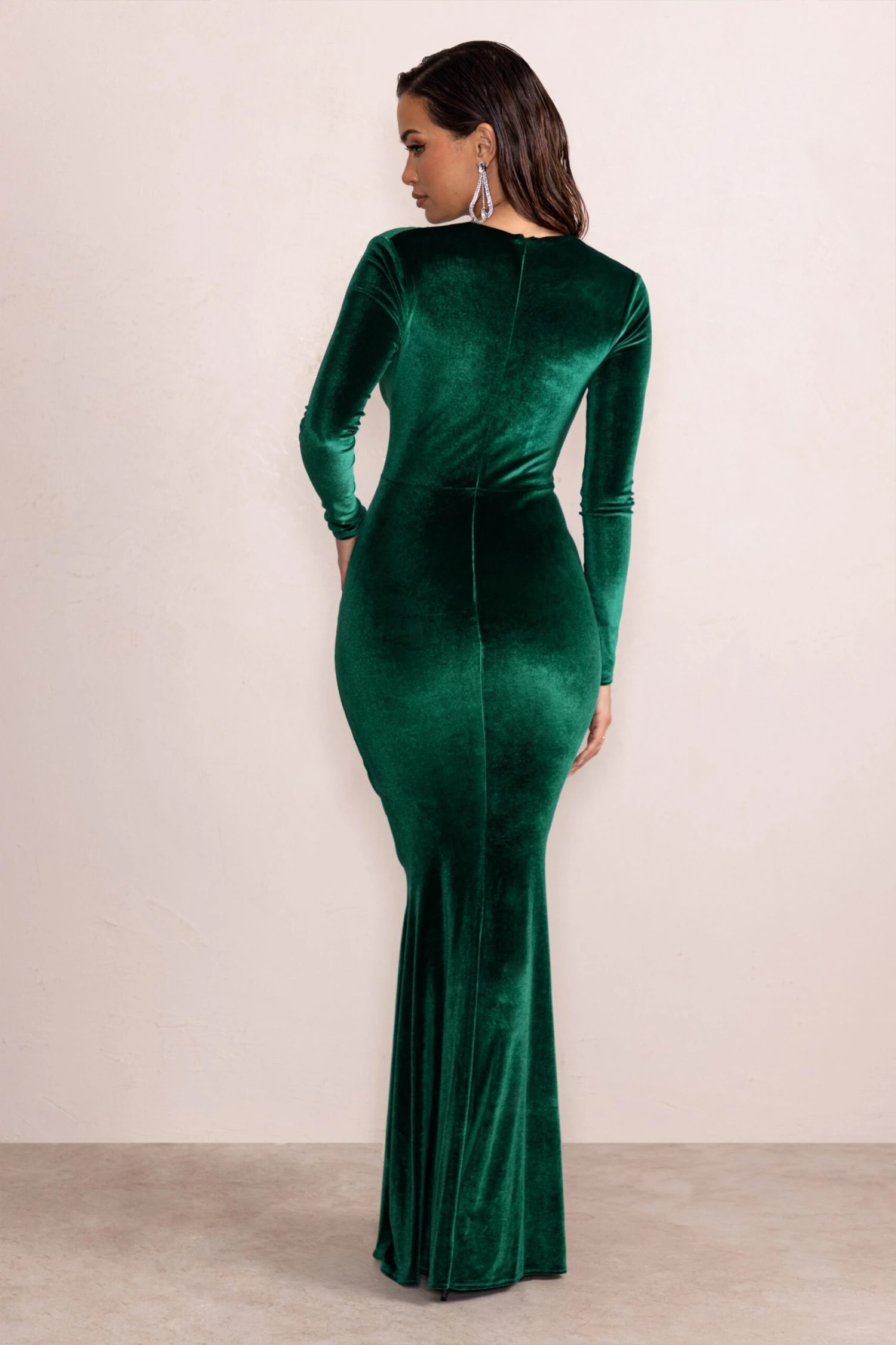 Elivia | Bottle Green Velvet Long Sleeve Plunge Neck Maxi Dress