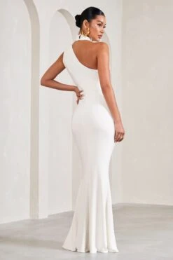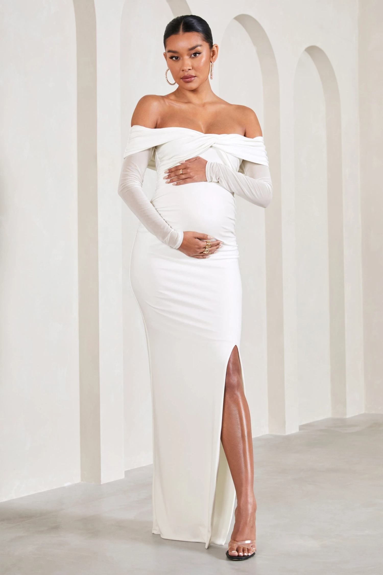 Get baby shower ready in our timeless white maxi Elsie. This sophisticated piece arrives in a premium stretch jersey and is detailed by a twisted bardot neckline that sits elegantly off the shoulders. Paired with long sheer sleeves, Elsie is finished with flattering bump ruching and a mid-leg split.Â