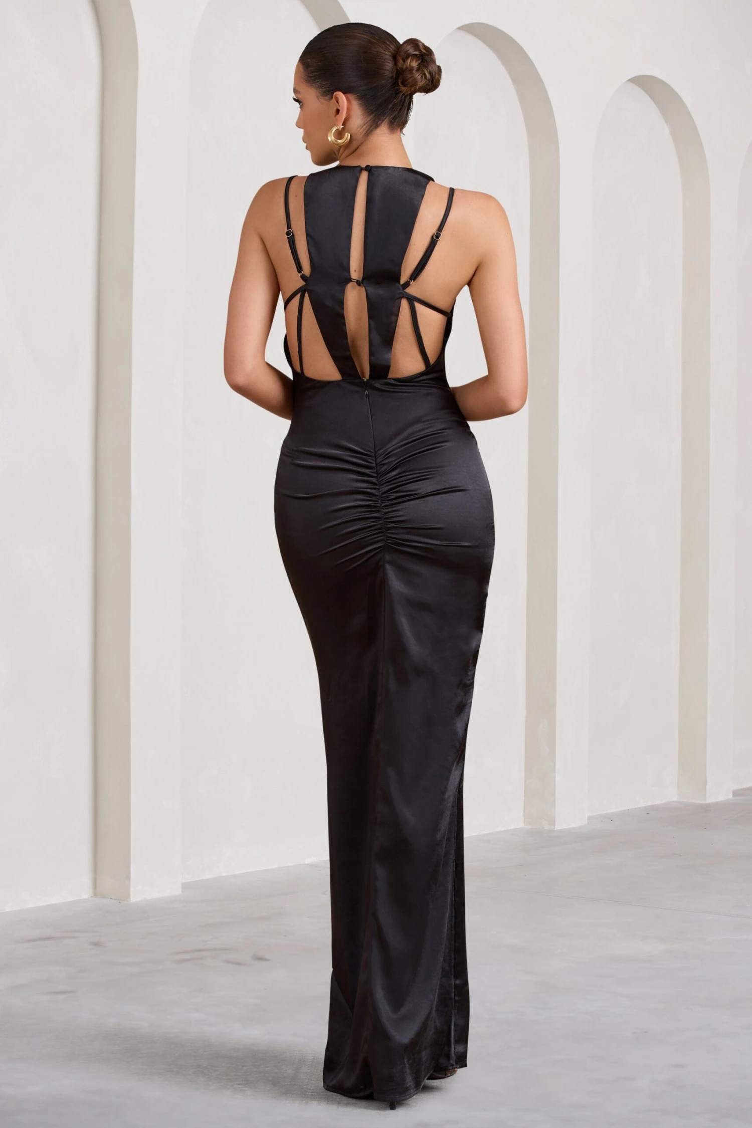 Emery | Black Satin Plunge Neck Strappy Back Maxi Dress