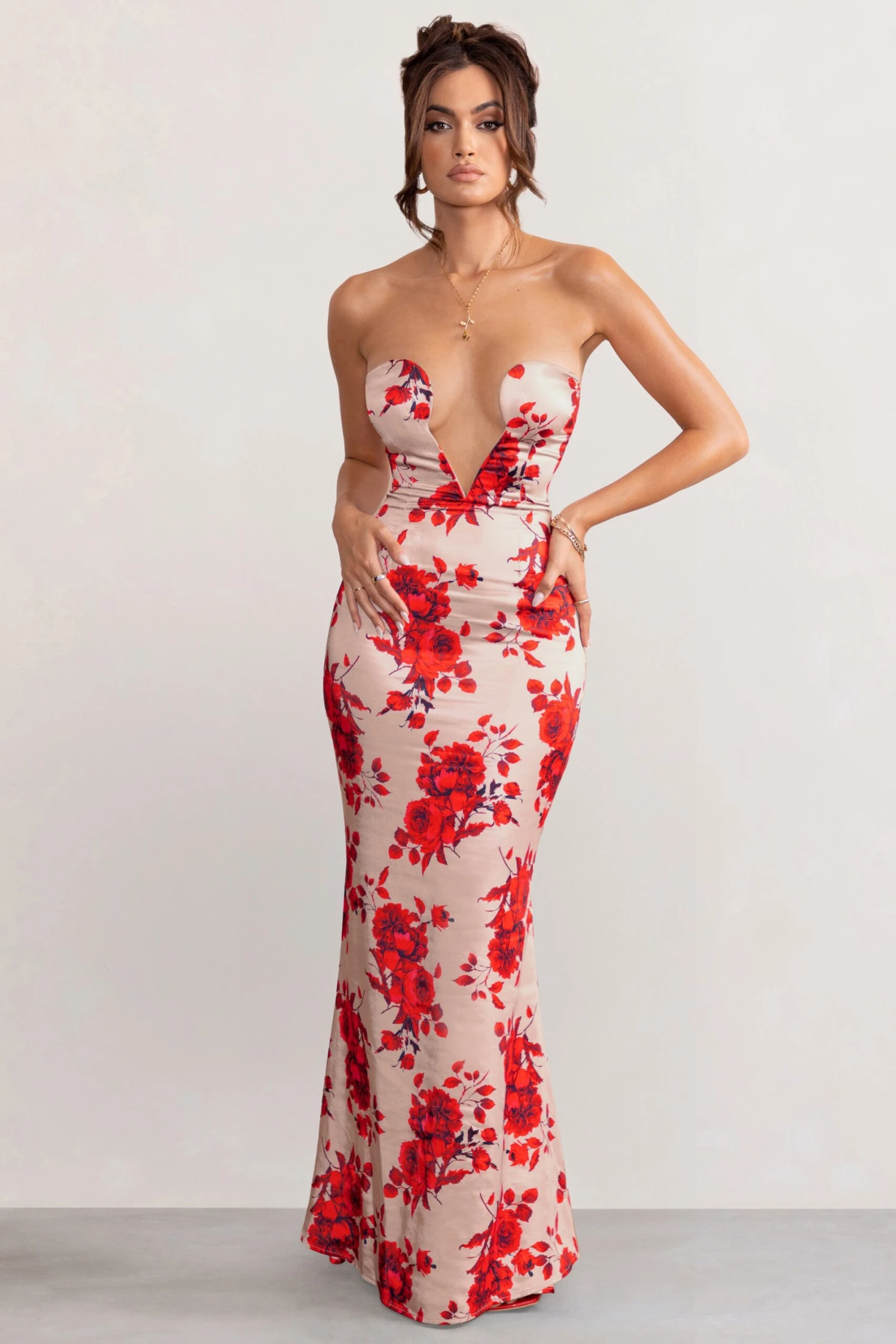 A state-of-art piece, you’ll fall in love with our Esme maxi dress. Carefully designed with our luscious satin fabric in a beautiful champagne shade with floral print detail, the sophisticated bandeau neckline of this maxi is perfect for showing off your decolletage and the plunge cut out is super alluring. Make an entrance to any occasion with its flattering bodycon fit finishing in a glamorous fishtail hemline creating an endless hourglass effect. Stand out with this enchanting design!