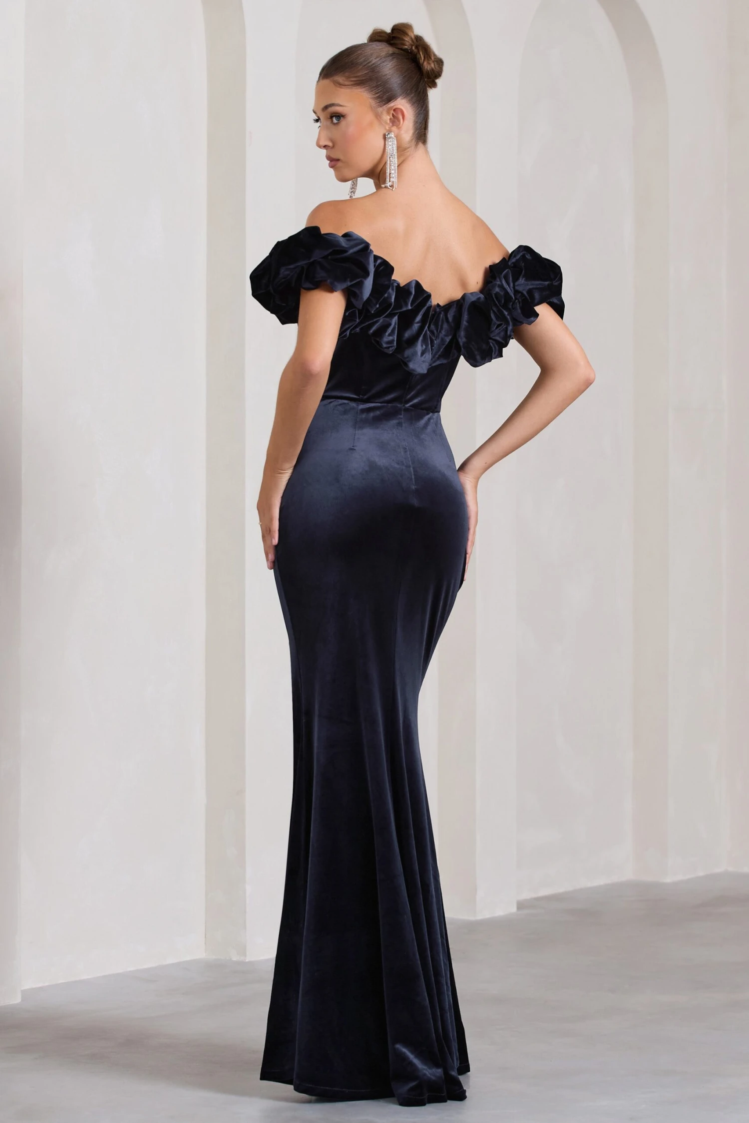 Esmeralda | Navy Velvet Structured Ruffled Bardot Maxi Dress