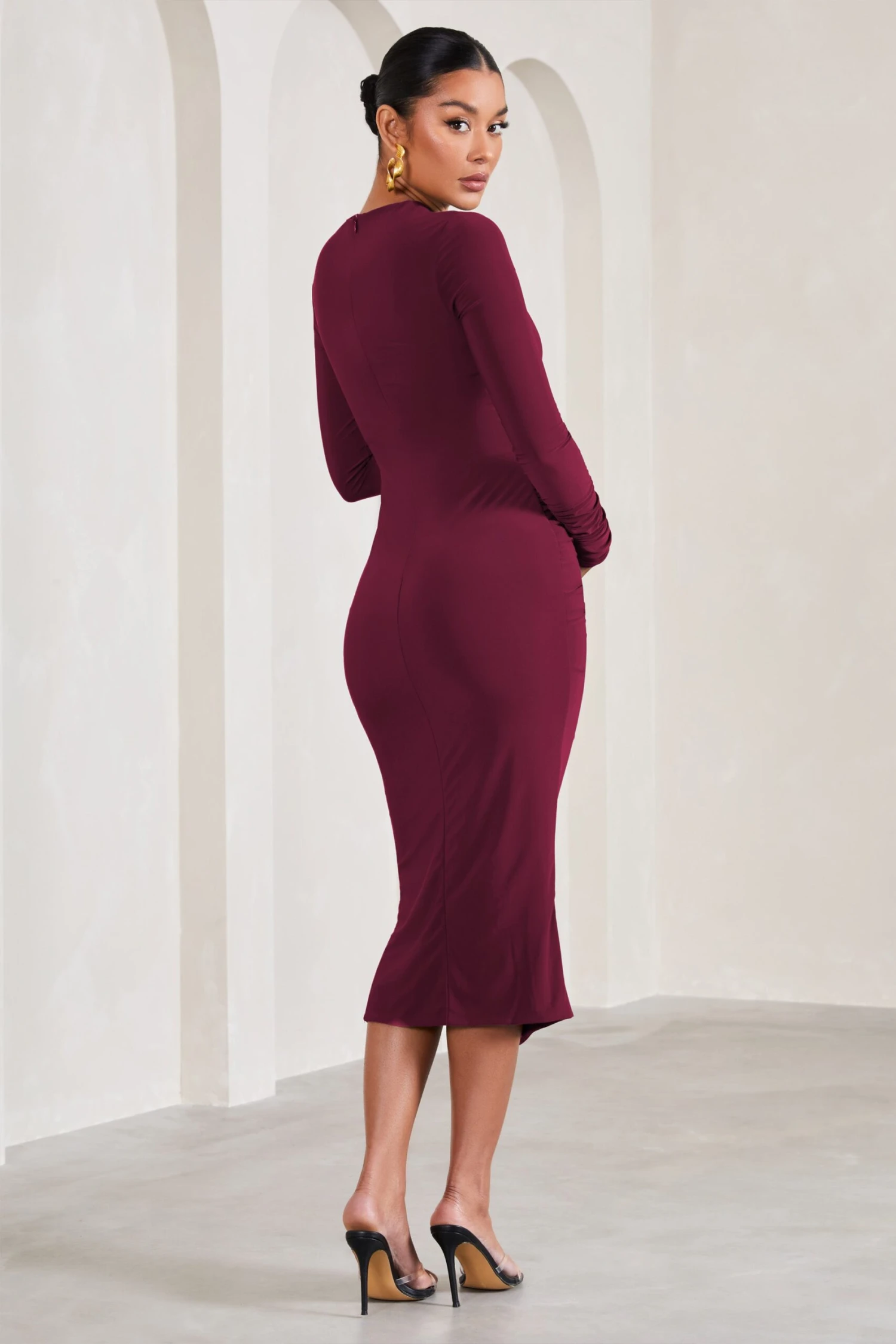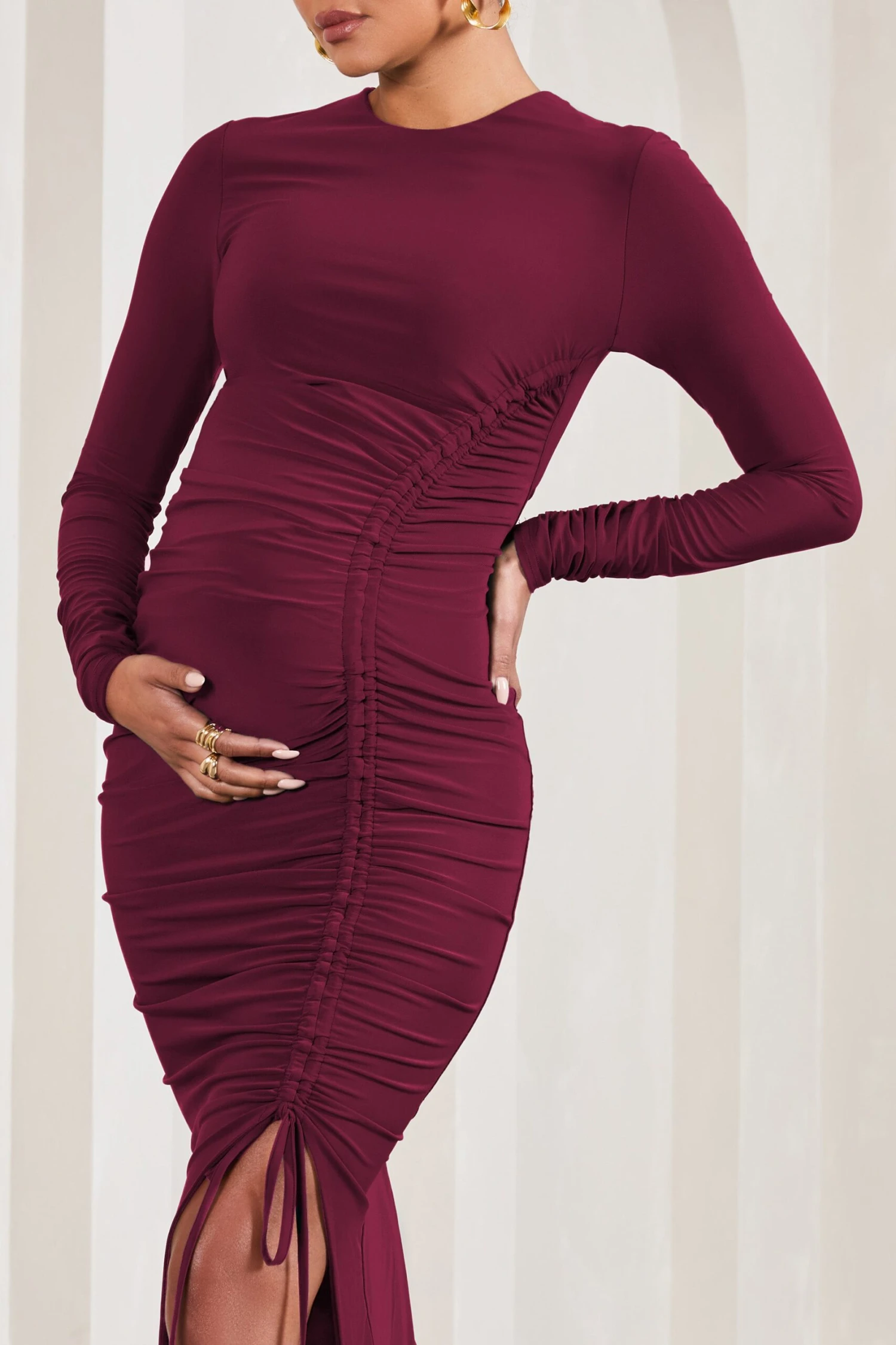 Curate a wardrobe of maternity staples starting with this burgundy midi Eternal. Crafted in a premium stretch jersey, this long-sleeved dress is flatteringly framed with a gathered drawstring and split hemline. Accompanied by some strappy stilettos, Eternal would make the perfect piece for a romantic date night.Â