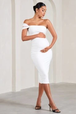 Simple yet graceful, our latest maternity midi dress is the perfect addition to any formal wardrobe. Eviana arrives in a soft white shade of our signature stretch jersey and is defined by a sophisticated bardot neckline enhanced by delicate twisting. This form-flattering midi also features subtle bump ruching and split hemline for ease of movement.Â