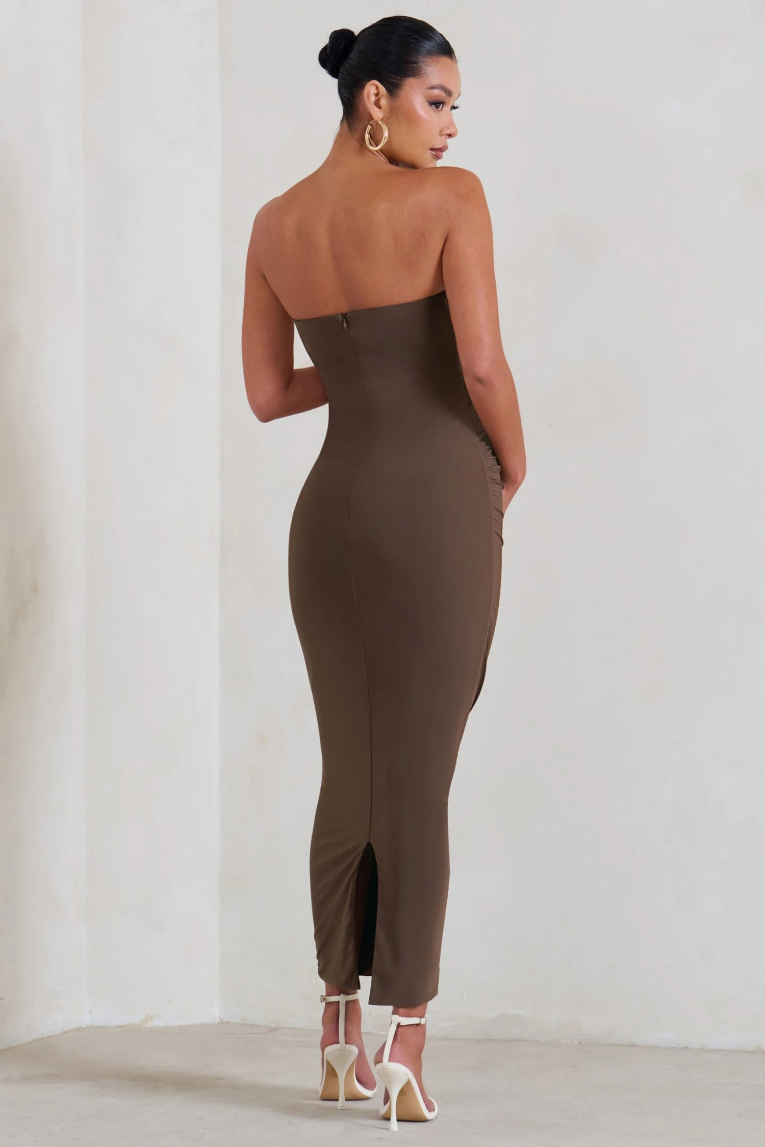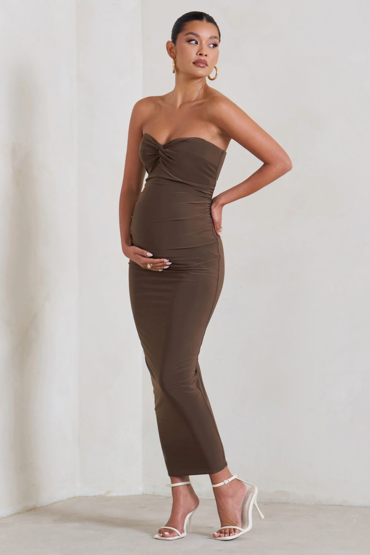 Our eye-catching Evita is the perfect midi dress for a mother-to-be, boasting a bodycon silhouette made from premium stretch jersey with a sweetheart neckline and a twisted knot detail. Finish this brown maternity dress with gold accessories for an unforgettable baby shower look.