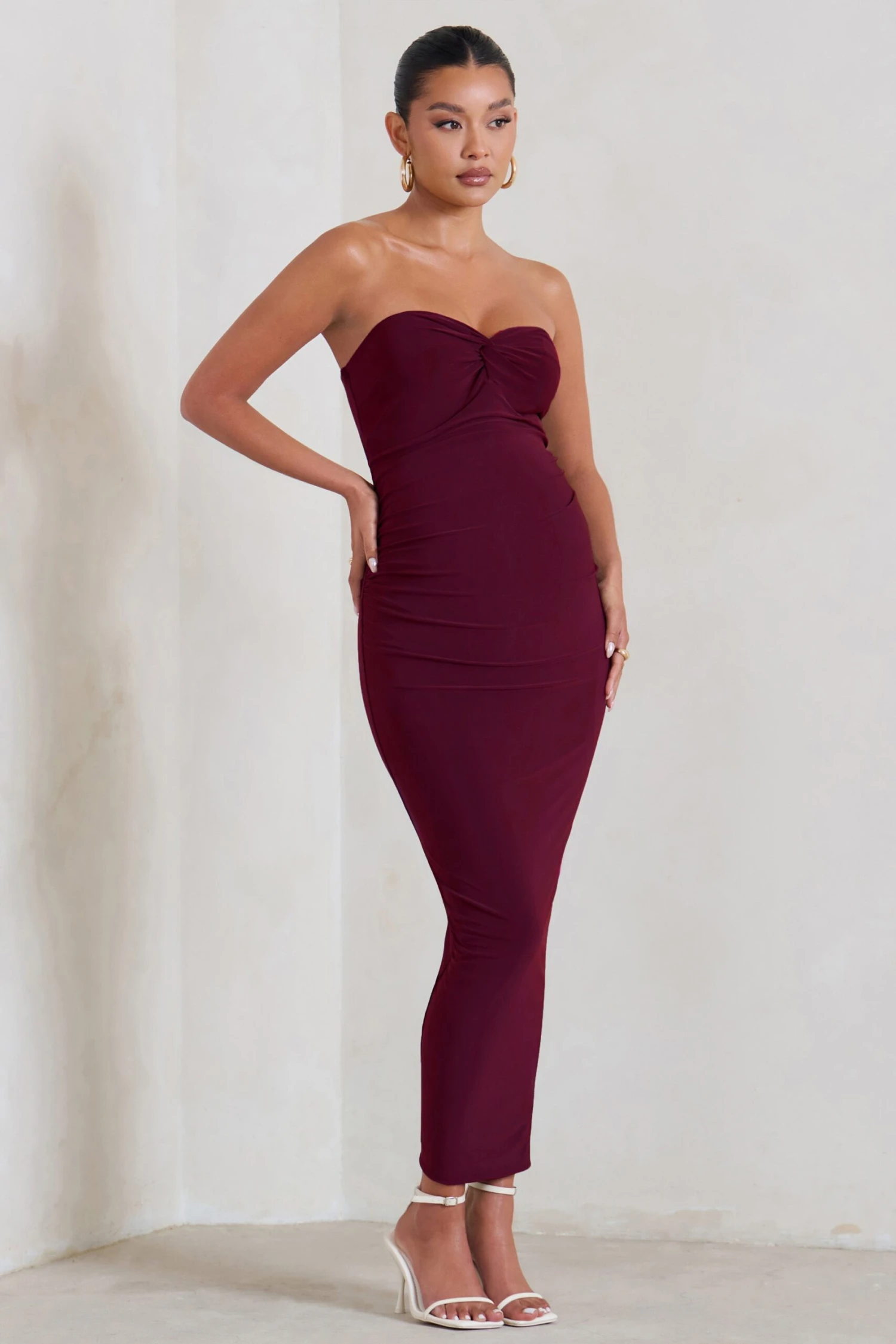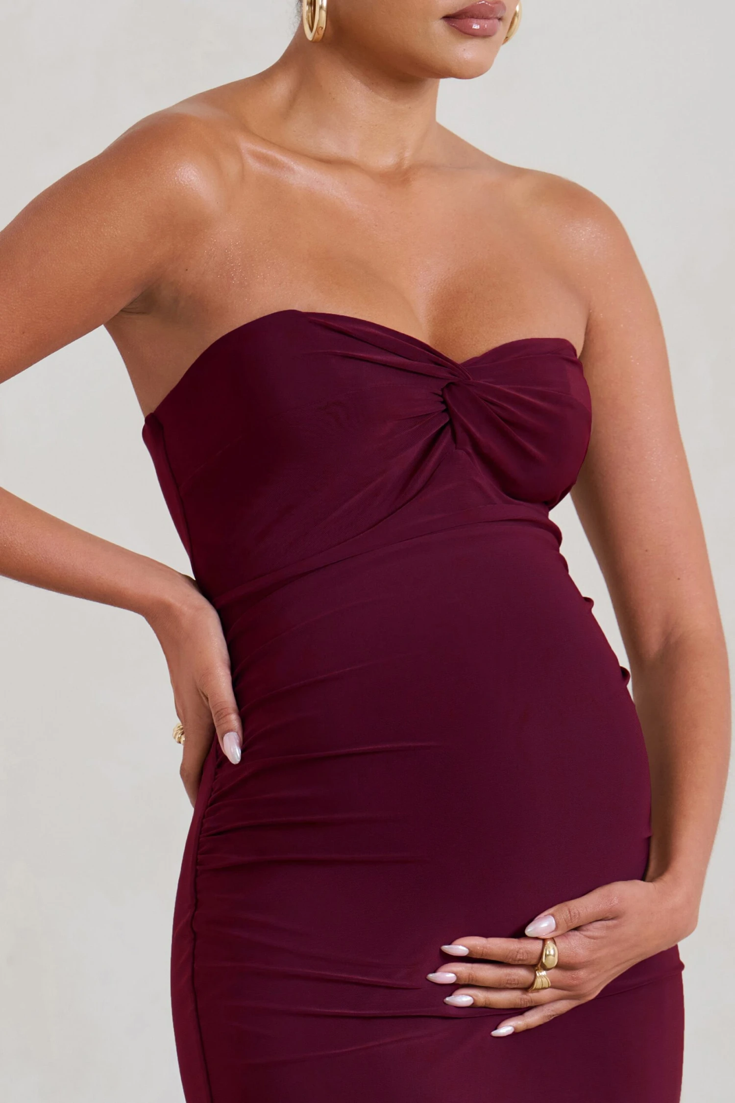 Our eye-catching Evita is the perfect midi dress for a mother-to-be, boasting a bodycon silhouette made from premium stretch jersey with a sweetheart neckline and a twisted knot detail. Finish this burgundy maternity dress with gold accessories for an unforgettable baby shower look.