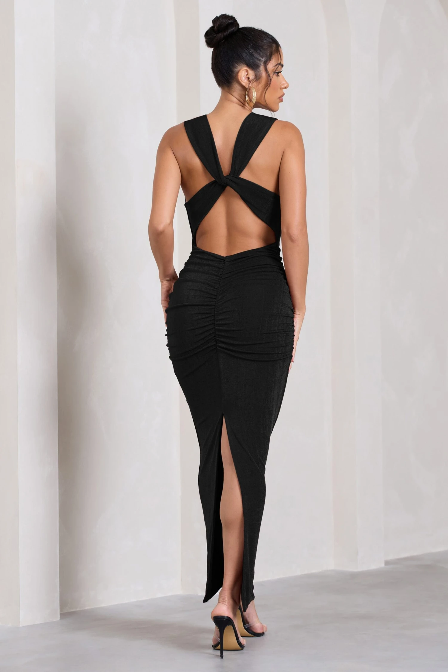 Defined by its twisted open back and plunge neckline, its all in the details with our black maxi Finely Formed. Crafted in our signature slinky acetate fabric, this ruched dress was designed to frame your figure effortlessly while providing you the maximum level of comfort. Finely Formed is a perfect option for your next dinner date or cocktail party.