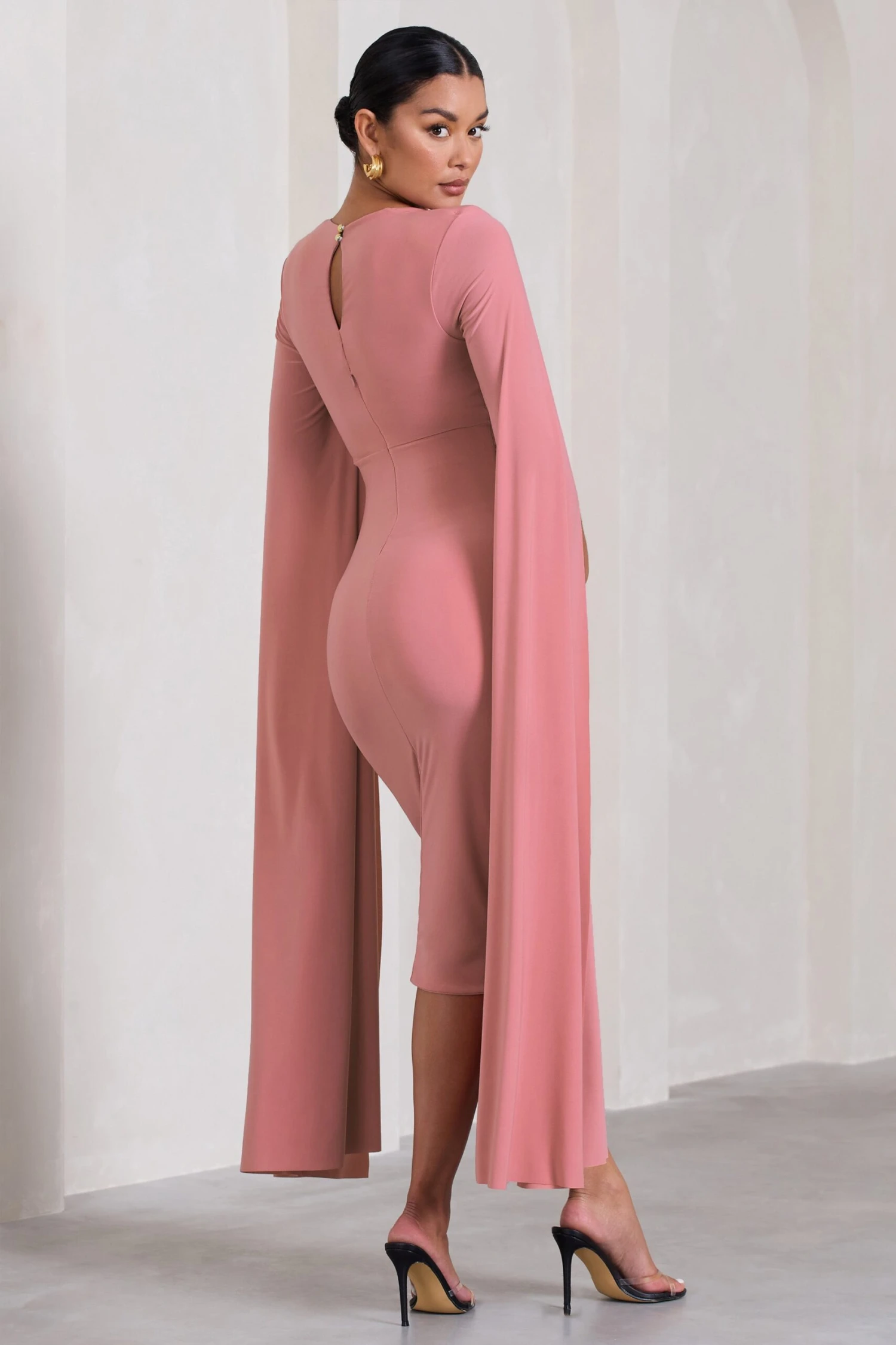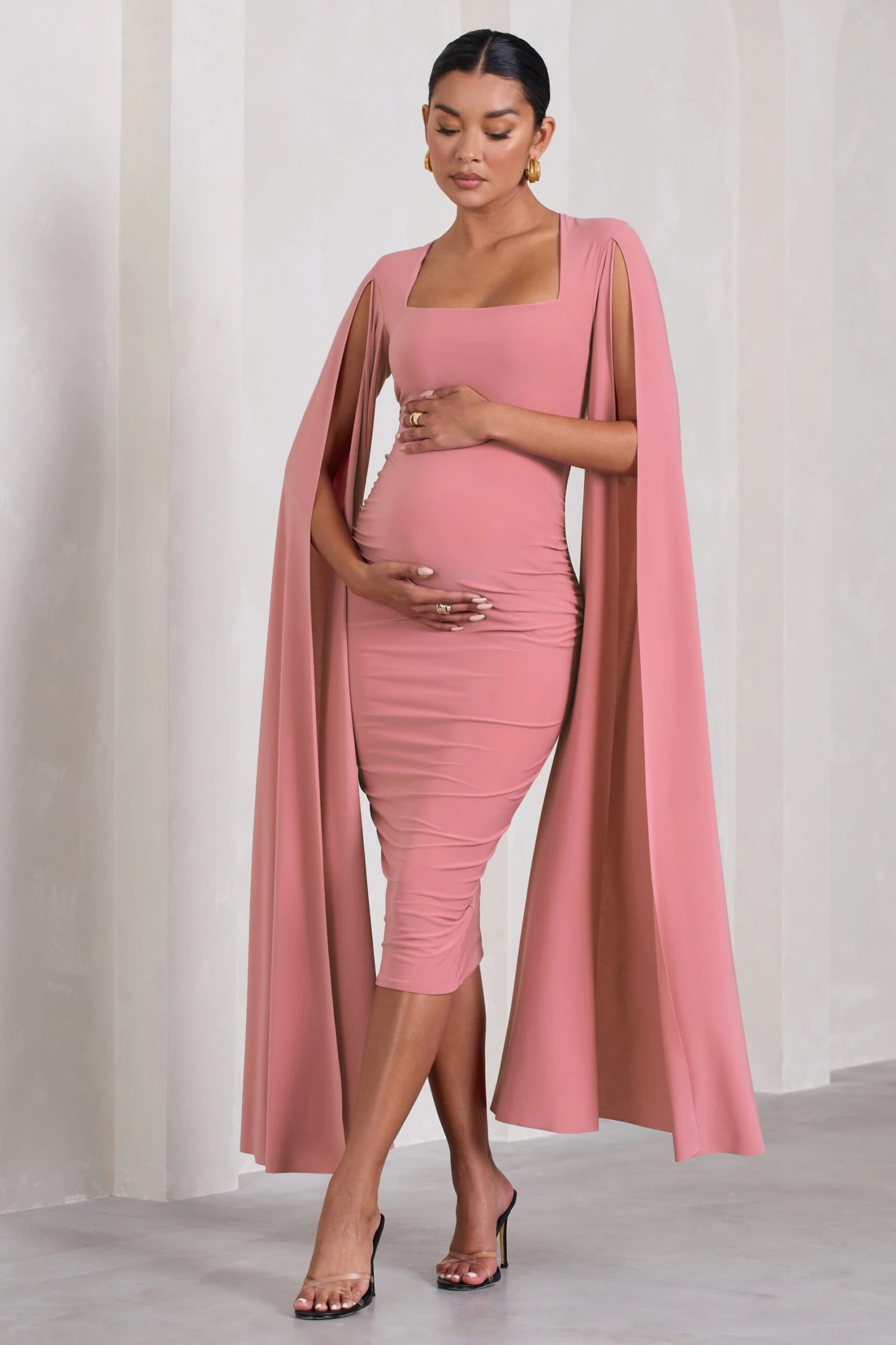 As flawless in fit as the name implies, this pink bodycon dress arrives in our signature stretch jersey with a square neckline and sweeping cape sleeves. Flawless is the ultimate maternity midi dress for any special occasion this season, from birthday brunches to grand ballroom weddings.