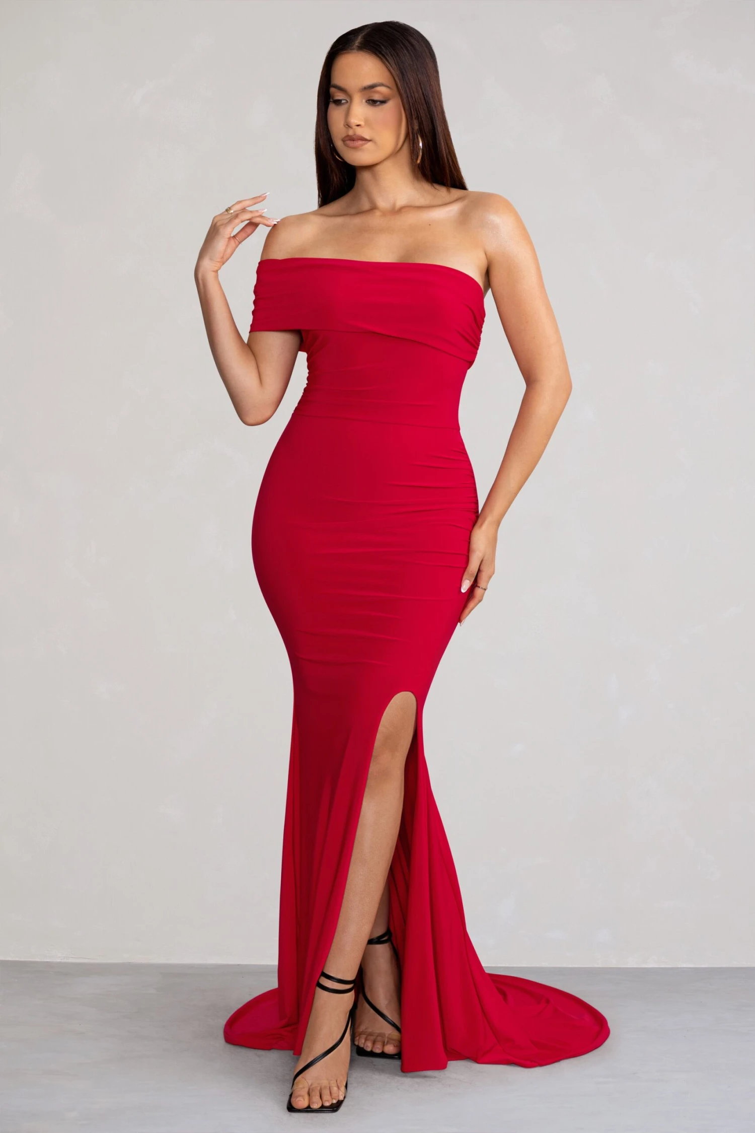 Opt for opulence this season with our formal staple, Forever & Always. Crafted in a rich red shade of a premium stretch jersey, this enchanting maxi dress features an elegant bardot neckline, high-leg split and fishtail train. For an effortless black tie look, team yours with some strappy stilettos and statement earrings.Â