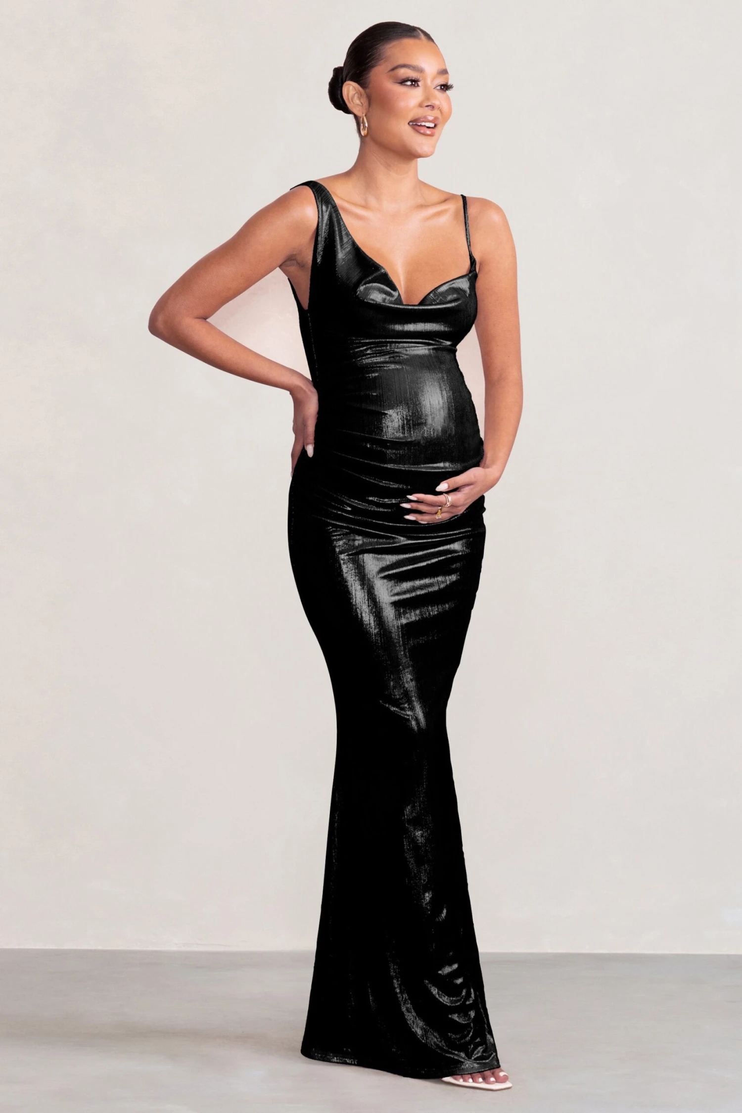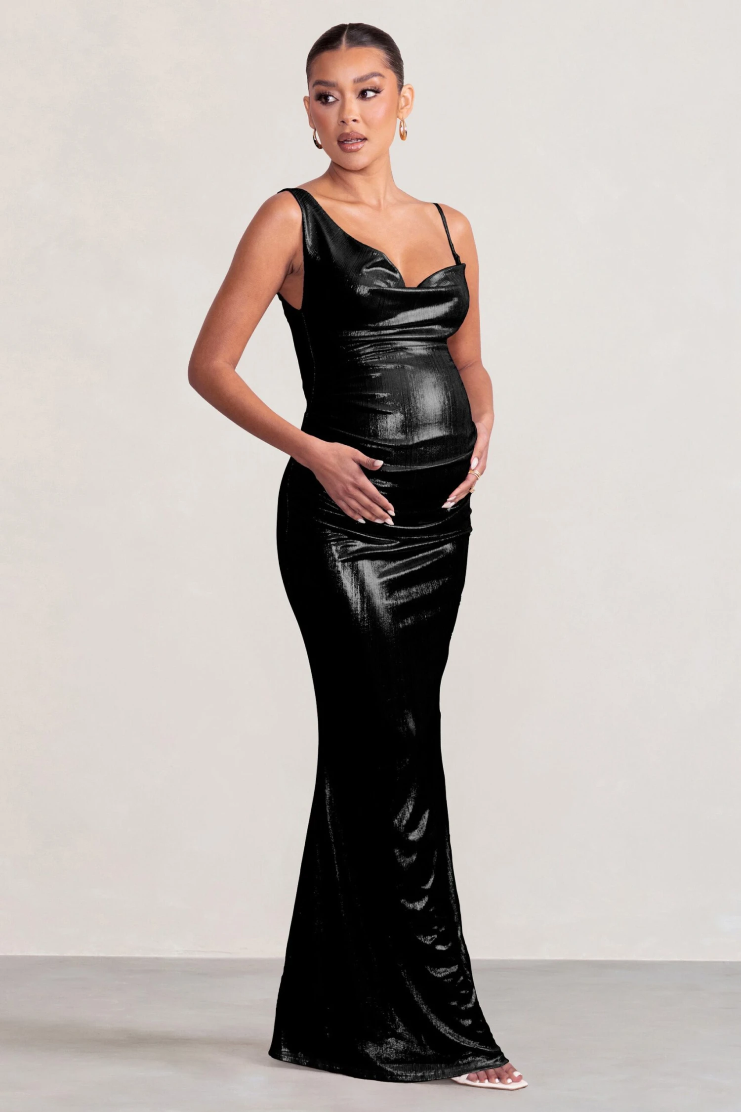 Dazzle and shine like celestial skies in our gorgeous Galaxy Shimmer maternity dress. Crafted from black lurex with excellent stretch to sculpt your silhouette, this metallic maxi would make a statement at any special occasion with its asymmetric cowl neckline, open back and cascading skirt. Complement Galaxy Shimmer‘s sparkle with diamond hoops and an encrusted clutch bag.