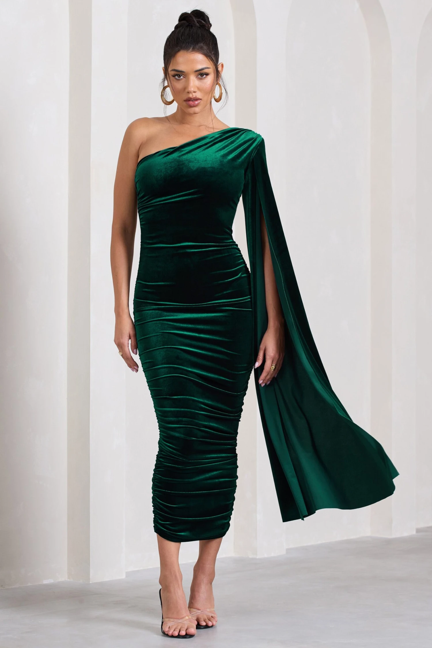 Crafted in an opulent stretch velvet, this one-shoulder midi is a formal must-have this party season. Arriving in a rich green shade, Gianna is detailed by an extravagant singular cape sleeve and flattering full body ruching. Try styling this bodycon dress with some strappy stilettos for the perfect work party ensemble.
